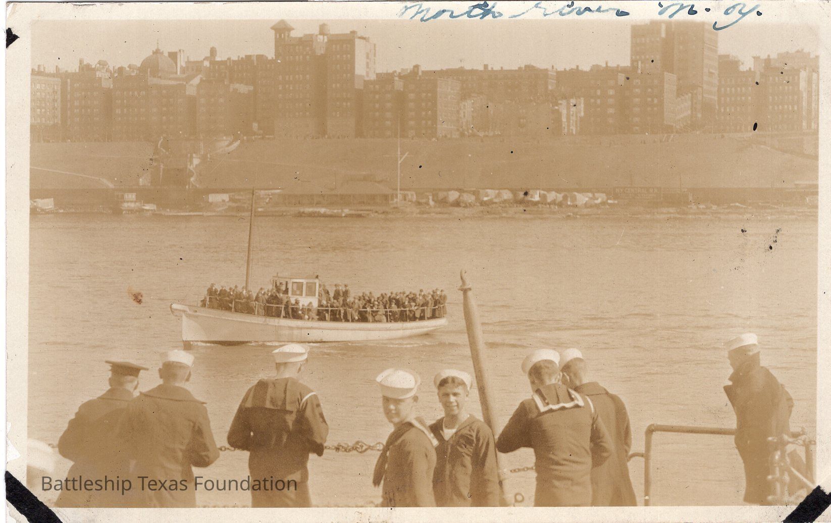 Features eight men standing on edge of deck with a utility boat full of passengers in the river. Cityscape in background.Context