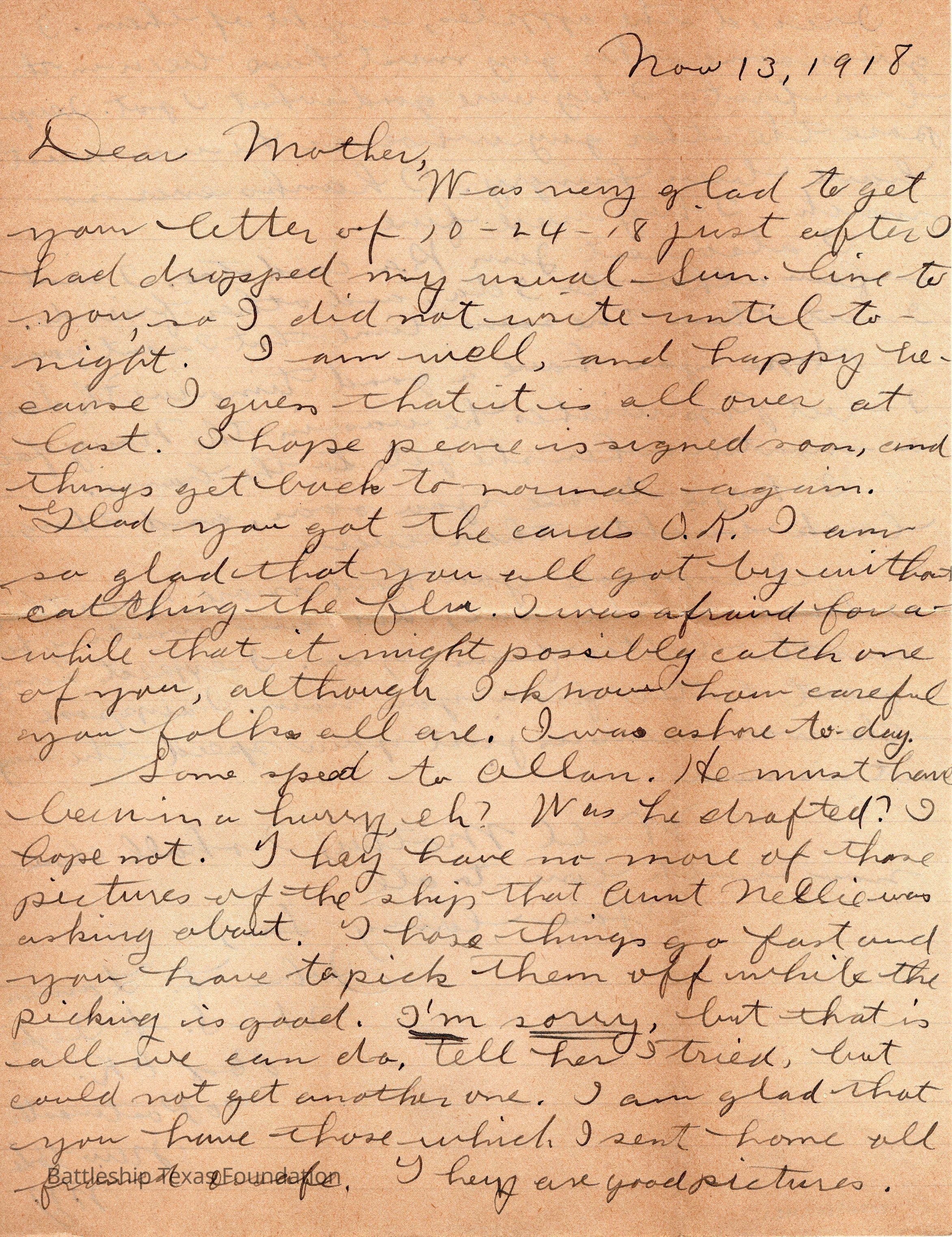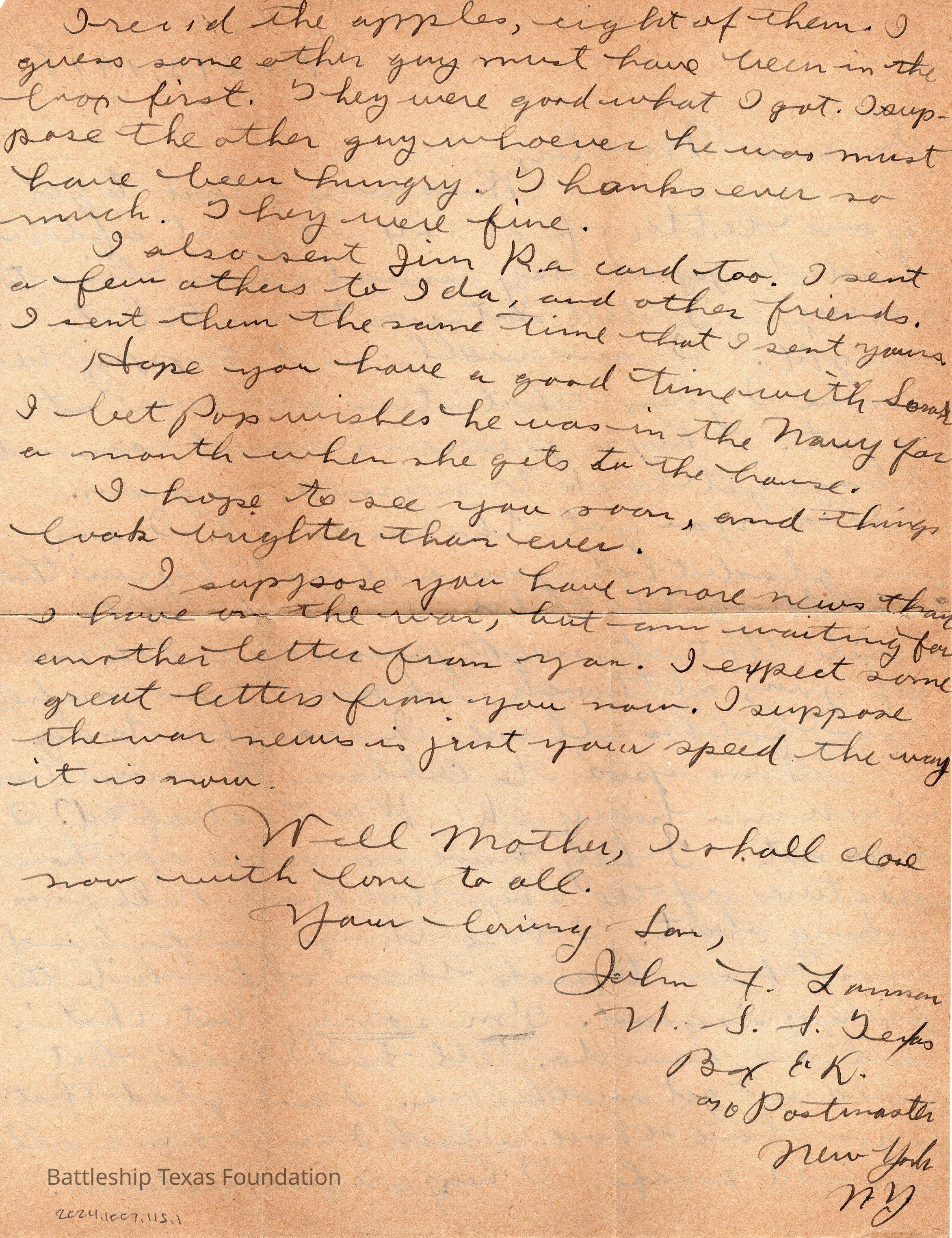 John Lamson was a MM1c on Battleship Texas from May 1917 to June 1919. Throughout his time on Texas, he sent a letter to his family at least once a week, often more. Longer stretches of absence are explained either by movement across the Atlantic, or with the Grand Fleet.