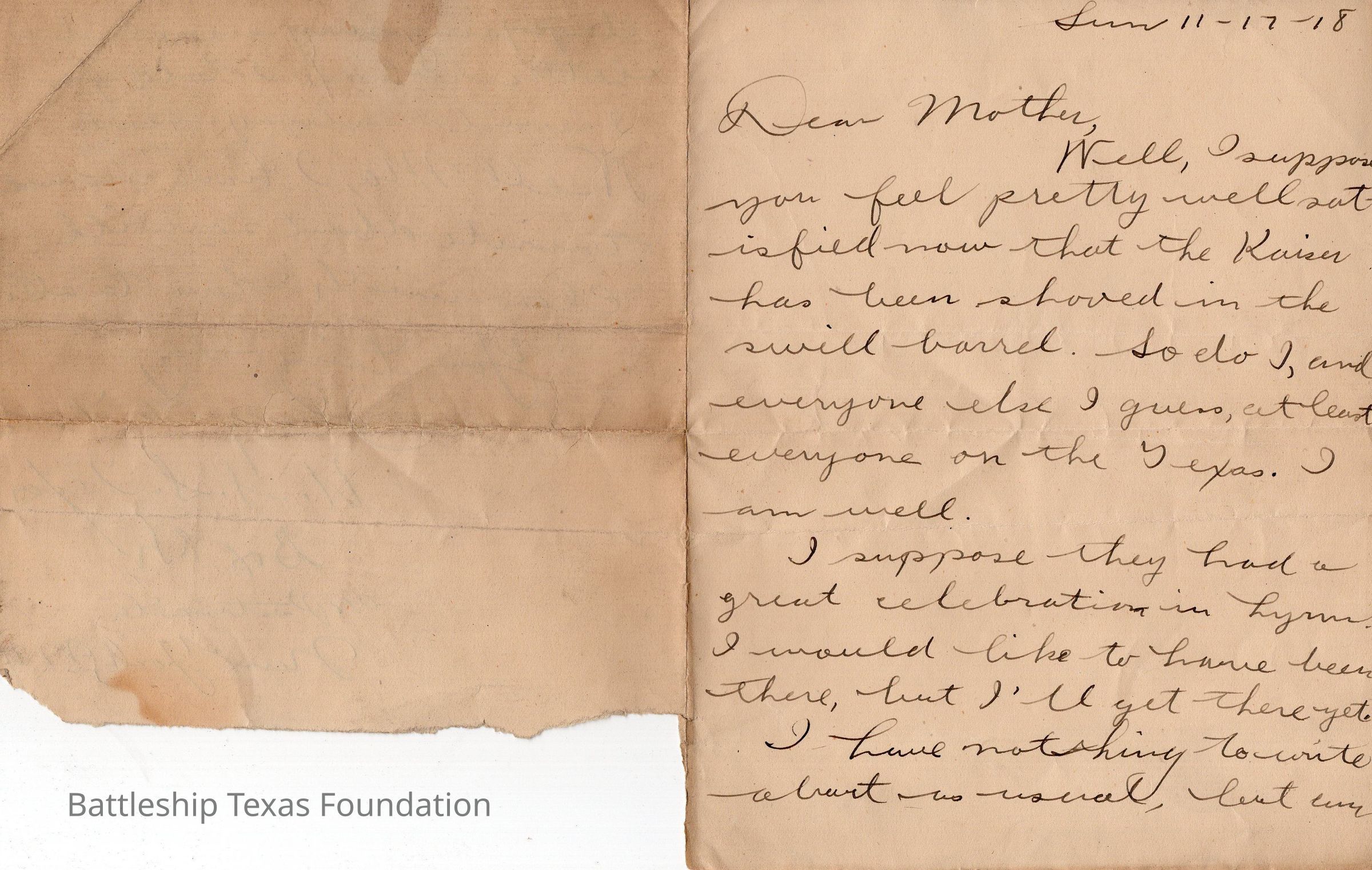 John Lamson was a MM1c on Battleship Texas from May 1917 to June 1919. Throughout his time on Texas, he sent a letter to his family at least once a week, often more. Longer stretches of absence are explained either by movement across the Atlantic, or with the Grand Fleet.