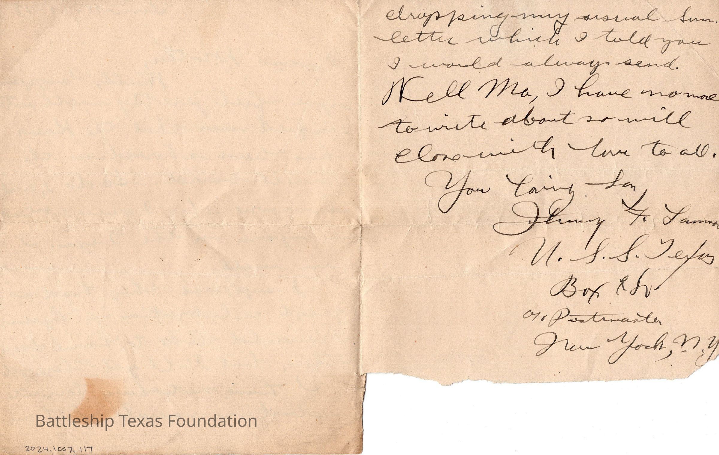Battleship Texas had her own post office. All mail passed through a censor before leaving the ship. Once the package is checked, it was stamped with a “U.S.S. TEXAS” stamp. If in a port, mail could carry the markers of the post office on shore.Collection