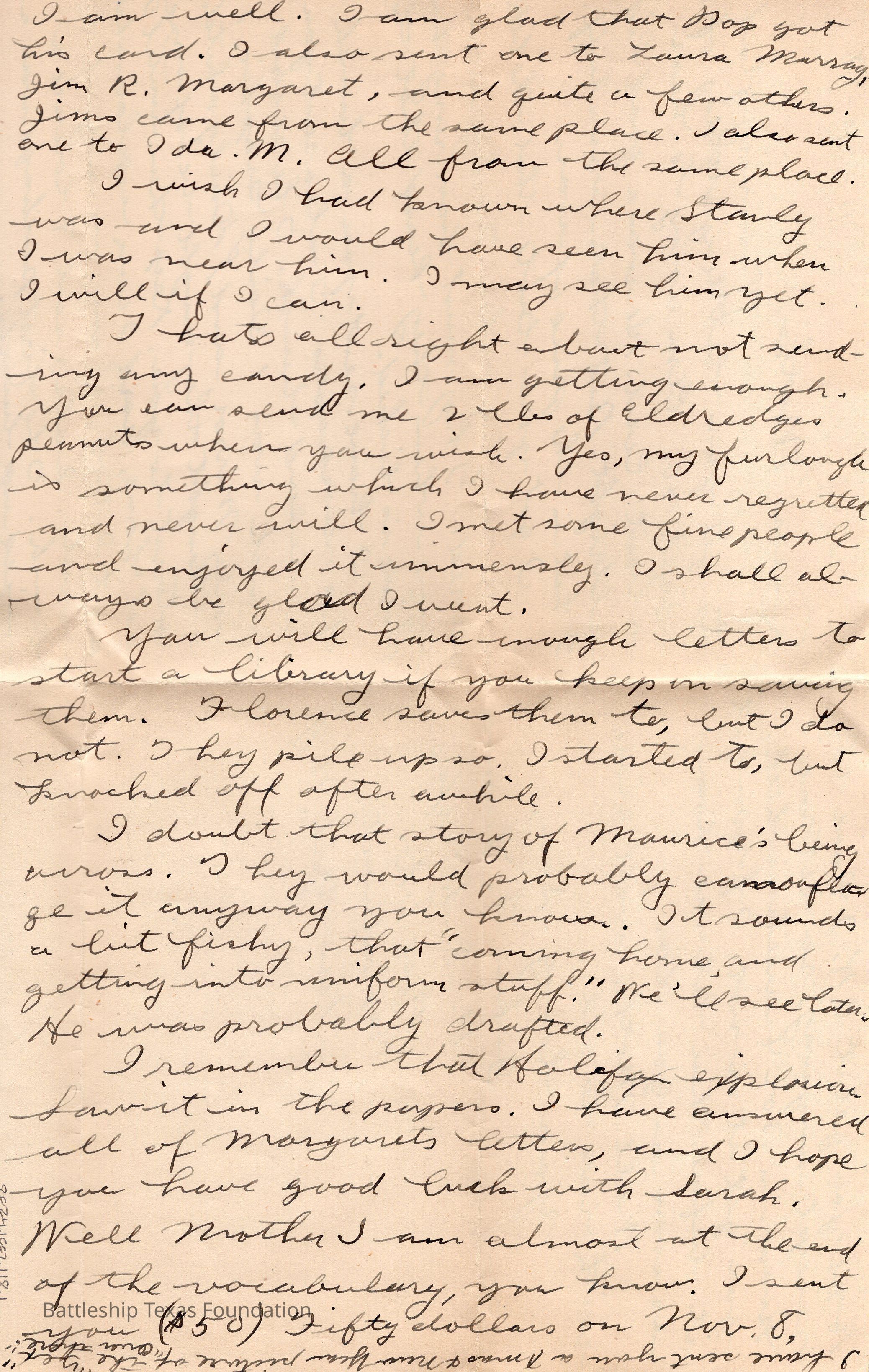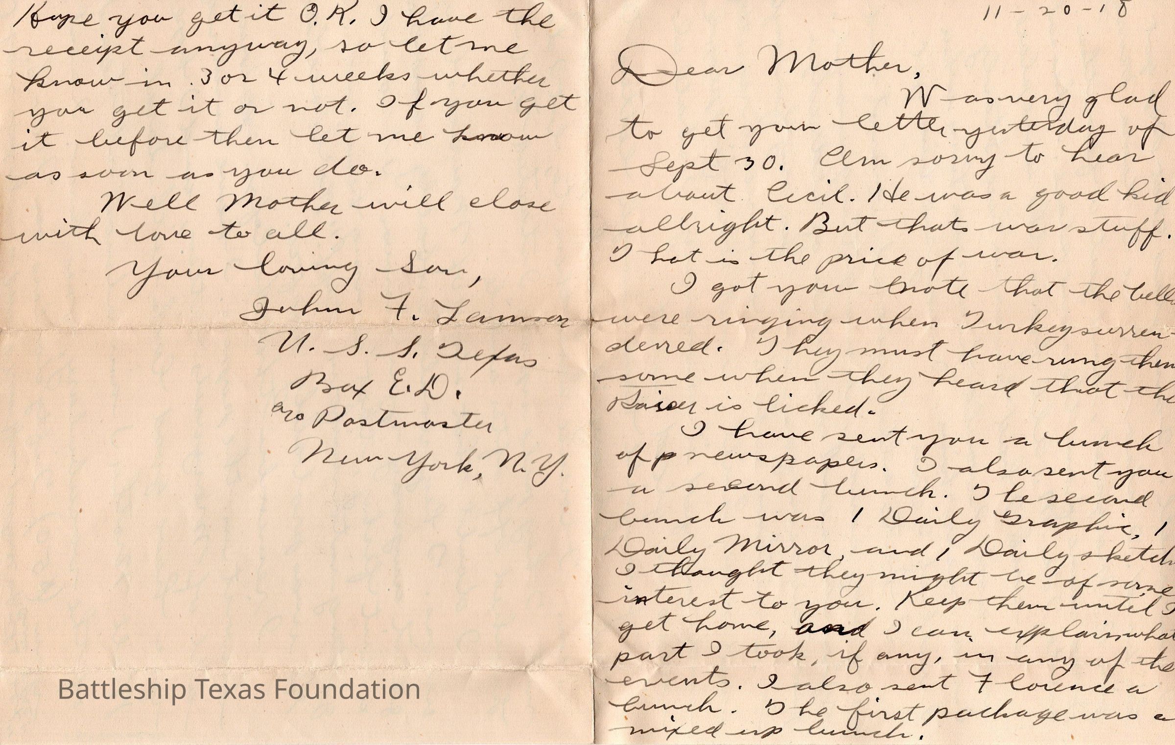 John Lamson was a MM1c on Battleship Texas from May 1917 to June 1919. Throughout his time on Texas, he sent a letter to his family at least once a week, often more. Longer stretches of absence are explained either by movement across the Atlantic, or with the Grand Fleet.