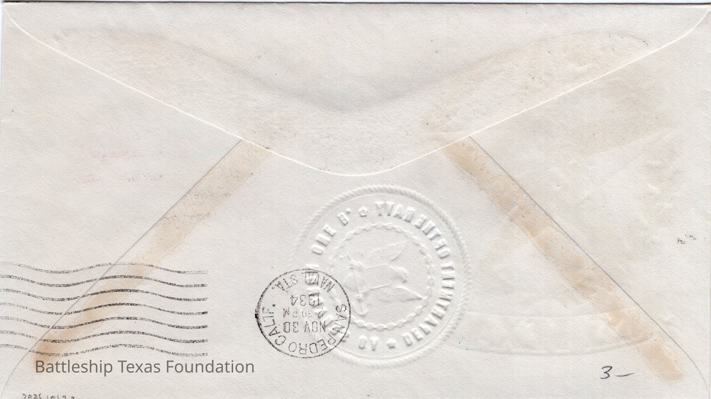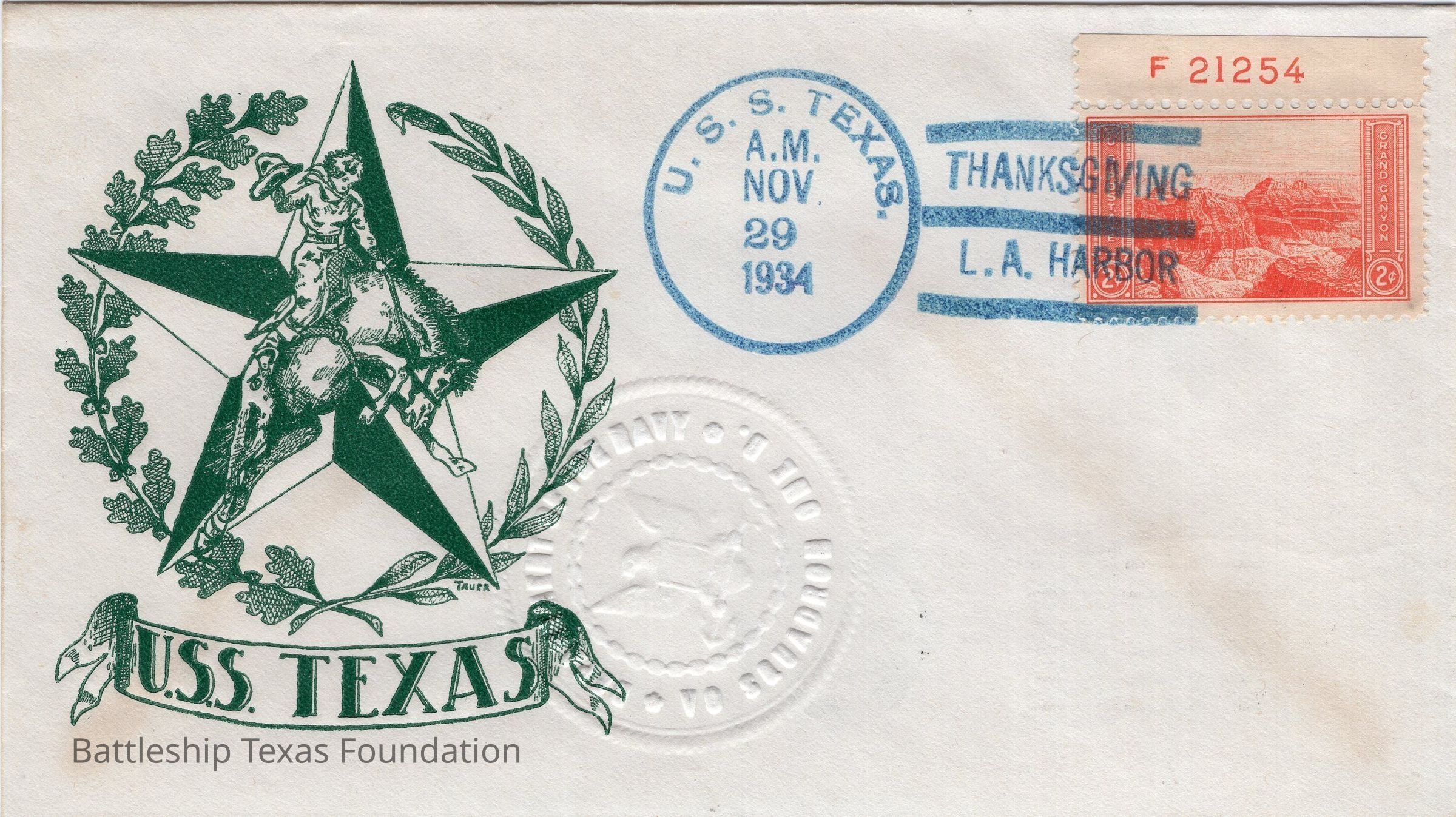 Envelope sent from USS Texas on the morning of November 29, 1934 from L.A. Harbor. Features a Thanksgiving stamp, and a USS Texas cowgirl in the foreground of a star wrapped in branches. Envelope embossed.Context