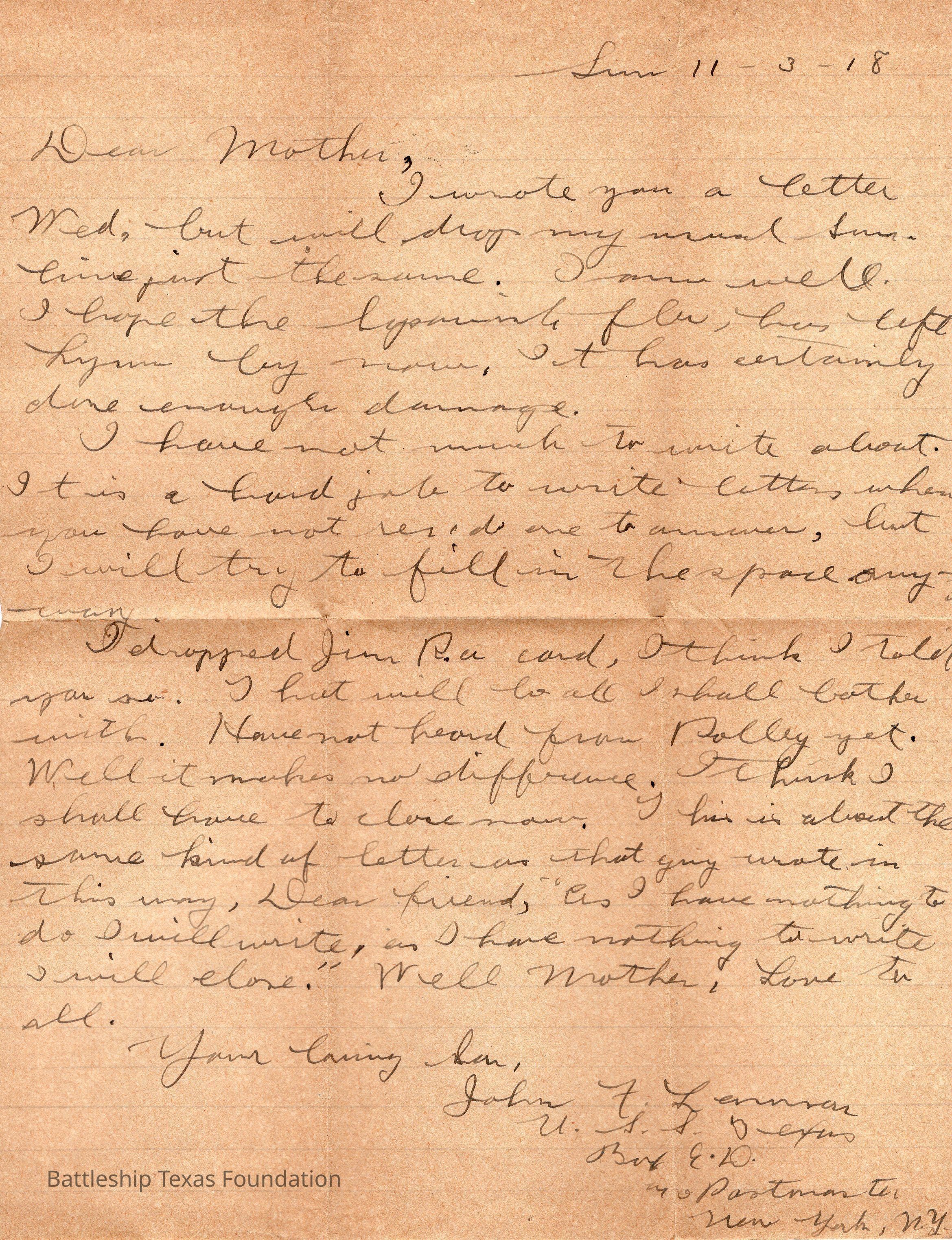 John Lamson was a MM1c on Battleship Texas from May 1917 to June 1919. Throughout his time on Texas, he sent a letter to his family at least once a week, often more. Longer stretches of absence are explained either by movement across the Atlantic, or with the Grand Fleet.