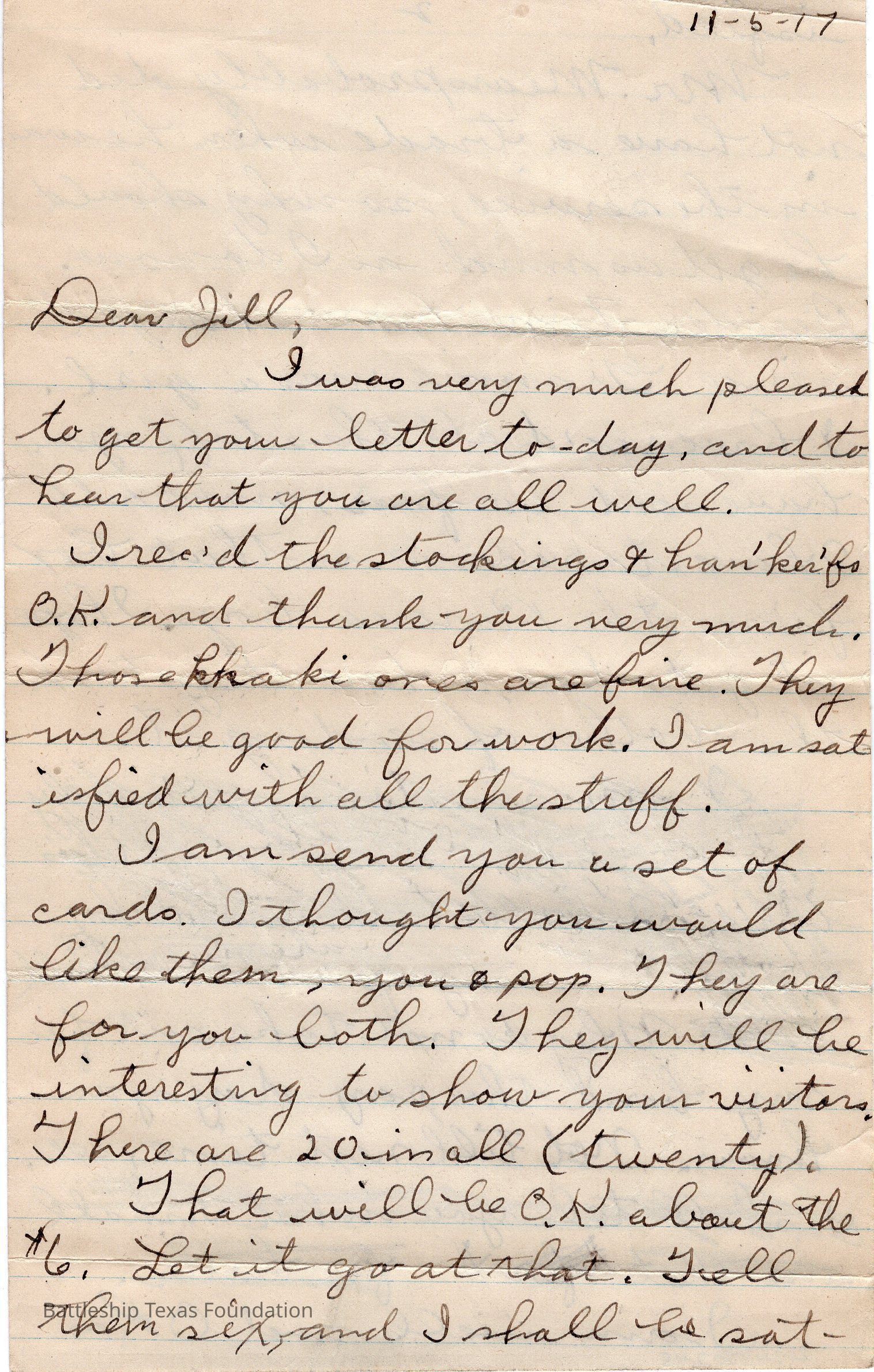 Letter dated 11-5-17 and addressed to Jill. Paragraph crossed out on back of letter.Context