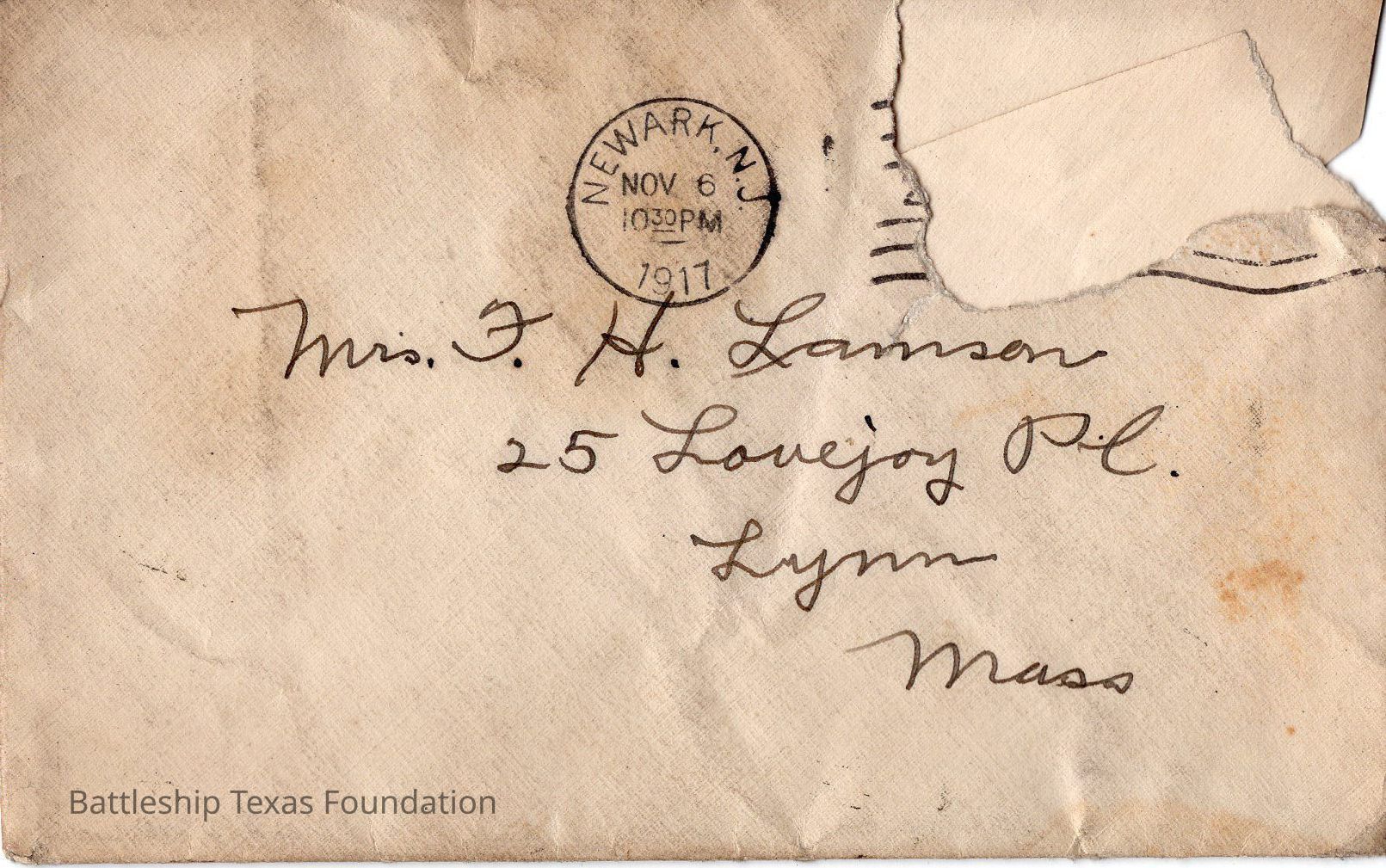 Envelope stamped "NEWARK, NJ NOV 6 1030PM 1917" and addressed to Mrs. Lamson.Context