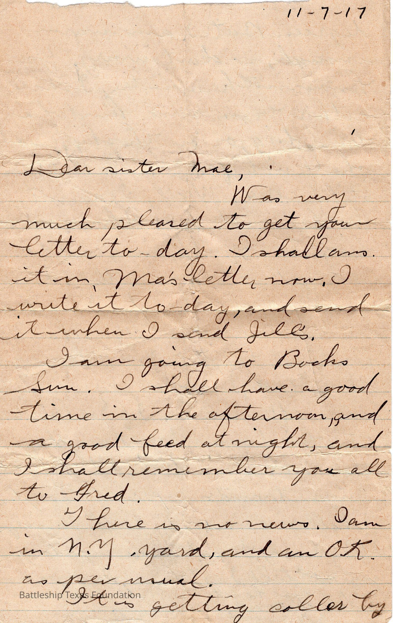 Letter dated 11-7-17 and addressed to sister MaeContext