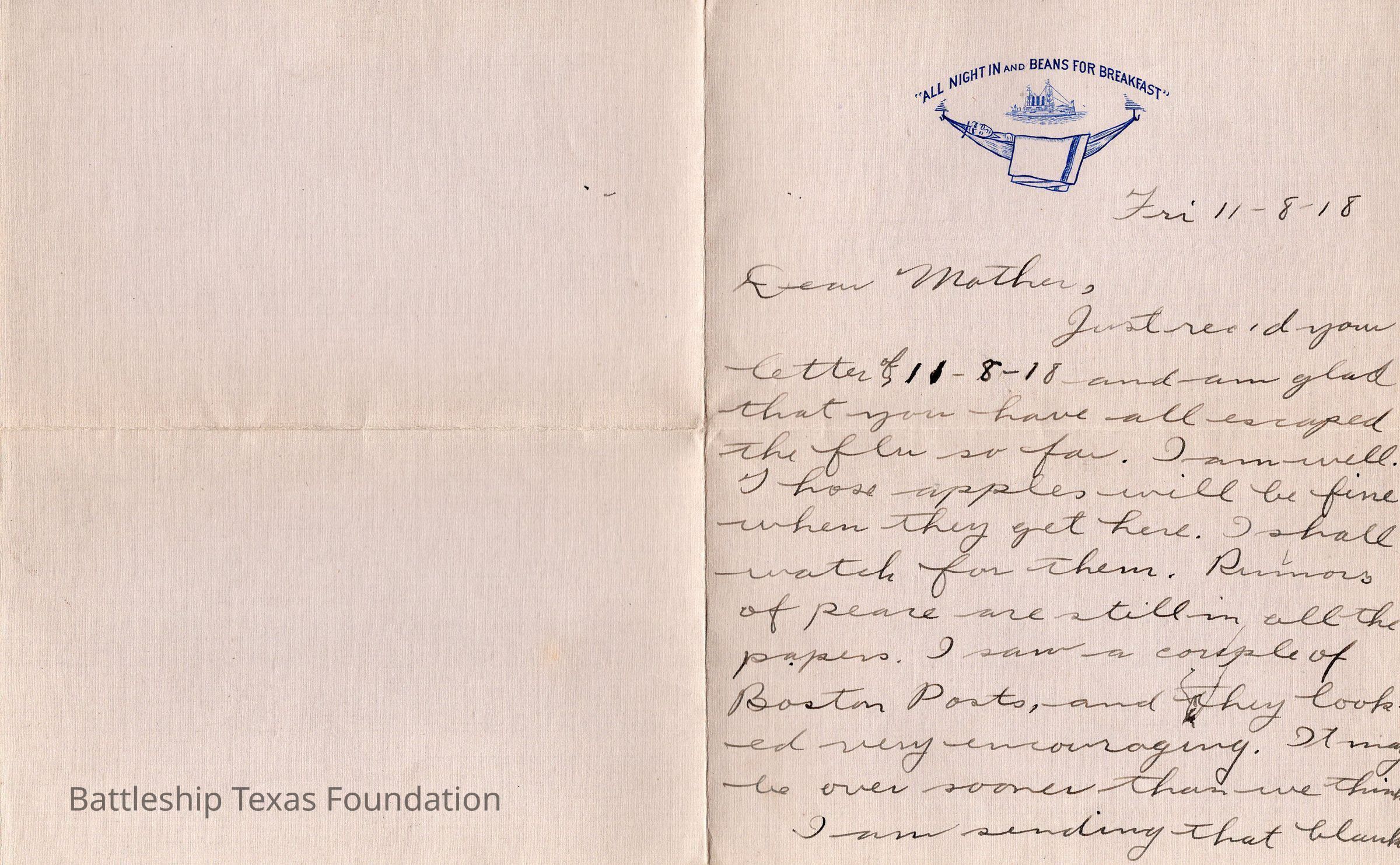 Letter dated 11-8-18 and addressed to Mother. Blue stamp on top.Context