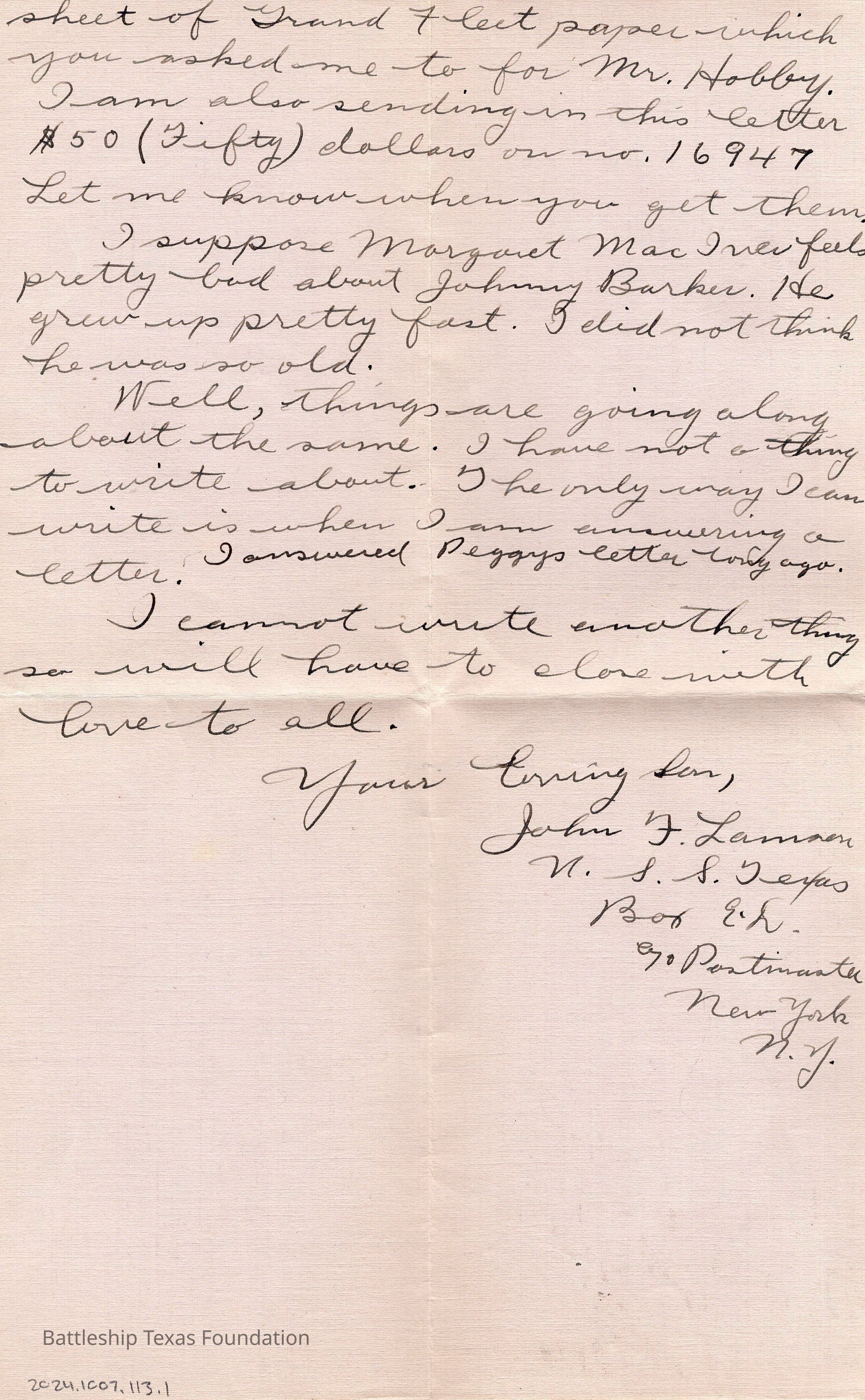 John Lamson was a MM1c on Battleship Texas from May 1917 to June 1919. Throughout his time on Texas, he sent a letter to his family at least once a week, often more. Longer stretches of absence are explained either by movement across the Atlantic, or with the Grand Fleet.