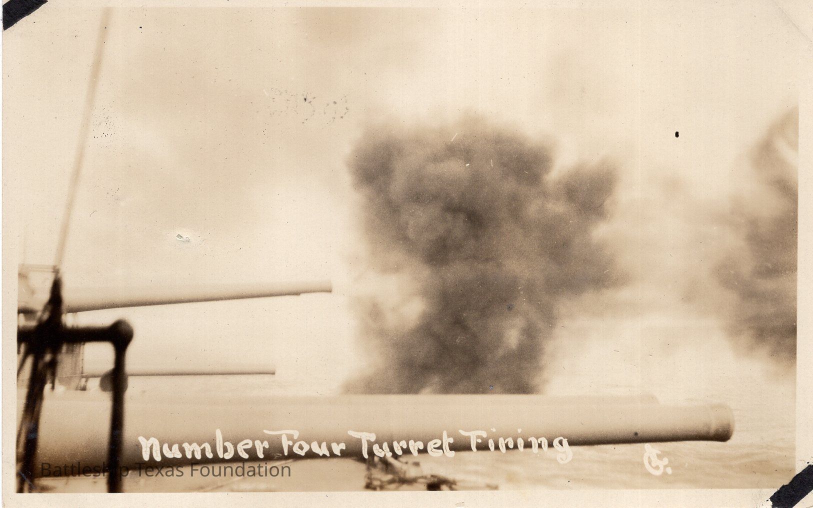 "One of the turrets letting go" and a caption on the bottom of the photo itself "Number Four Turret Firing"