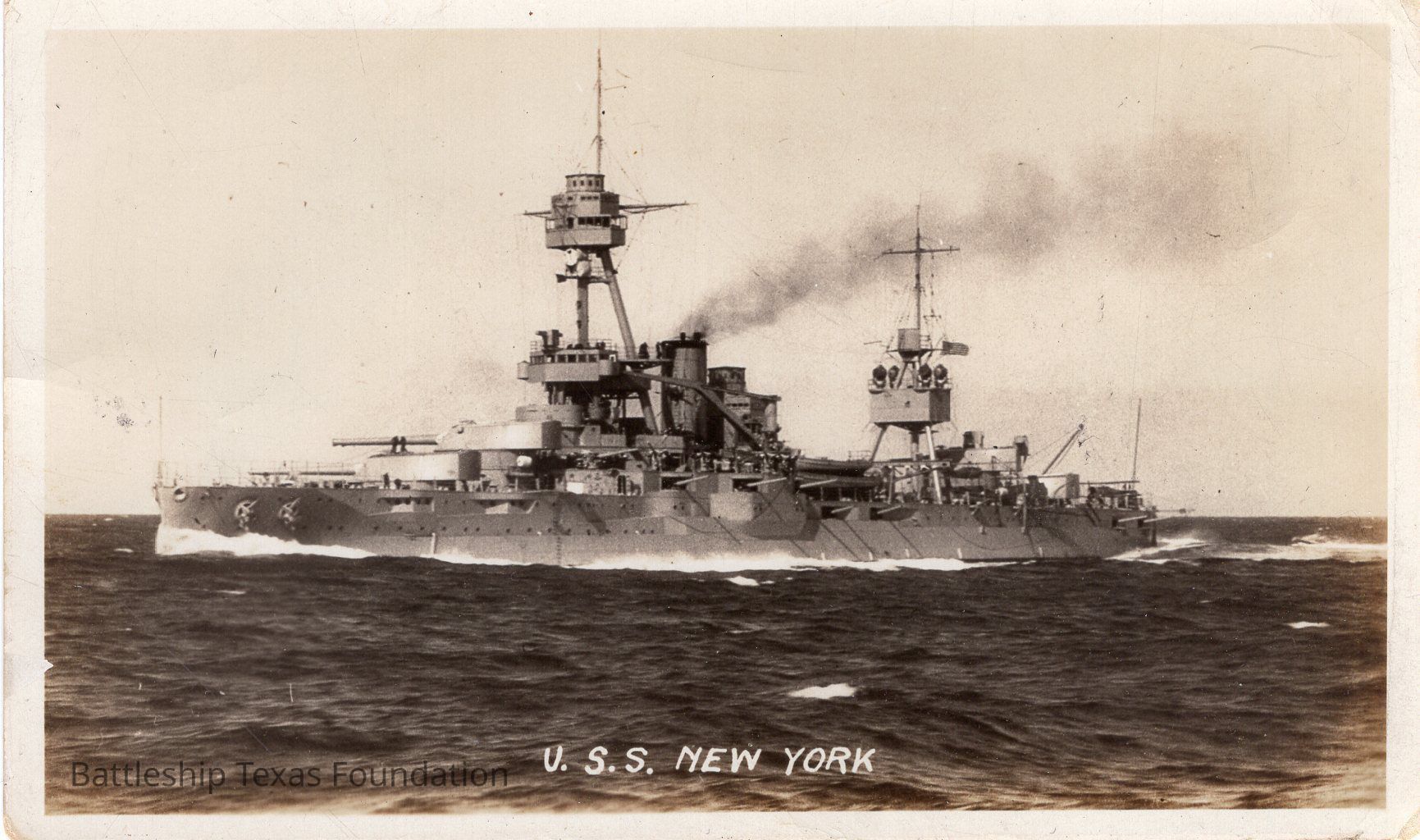 New York sailing to left of photo. Guns turned away from camera. captioned "U.S.S. NEW YORK"Context