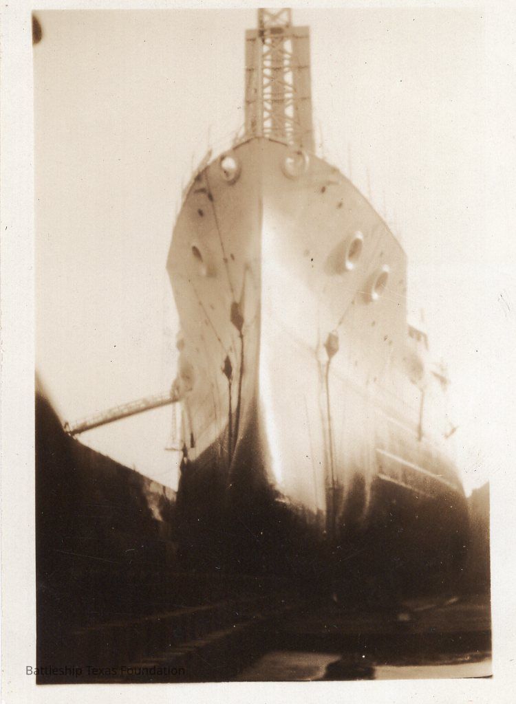 New York in drydock bow forward. gangway on left side of photo/starboard of ship.Context