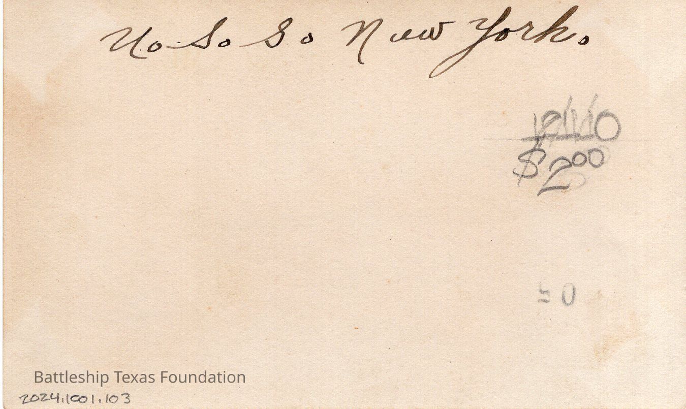 Battleship New York in open water facing the left of the photo. Back reads "U.S.S. New York."Context