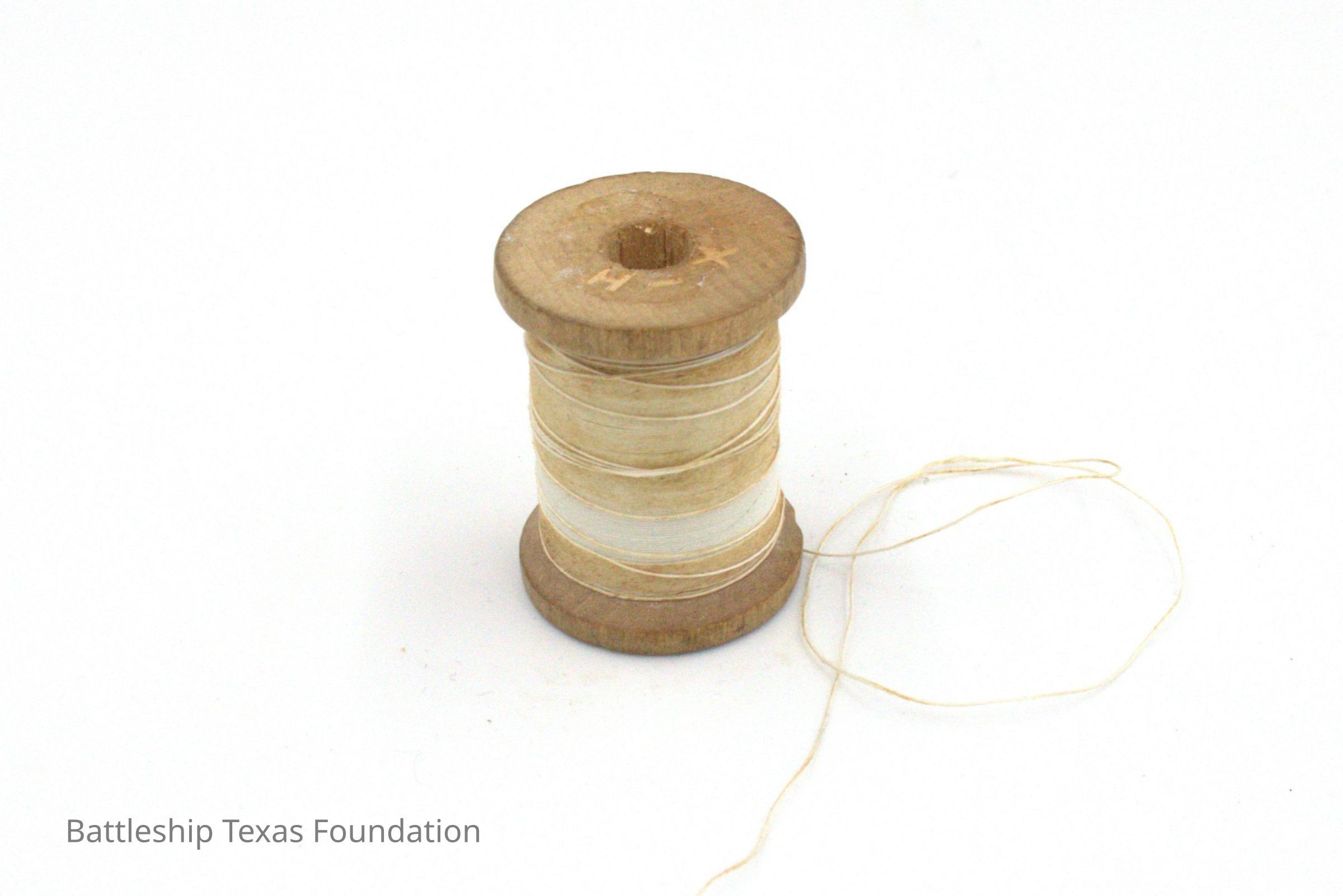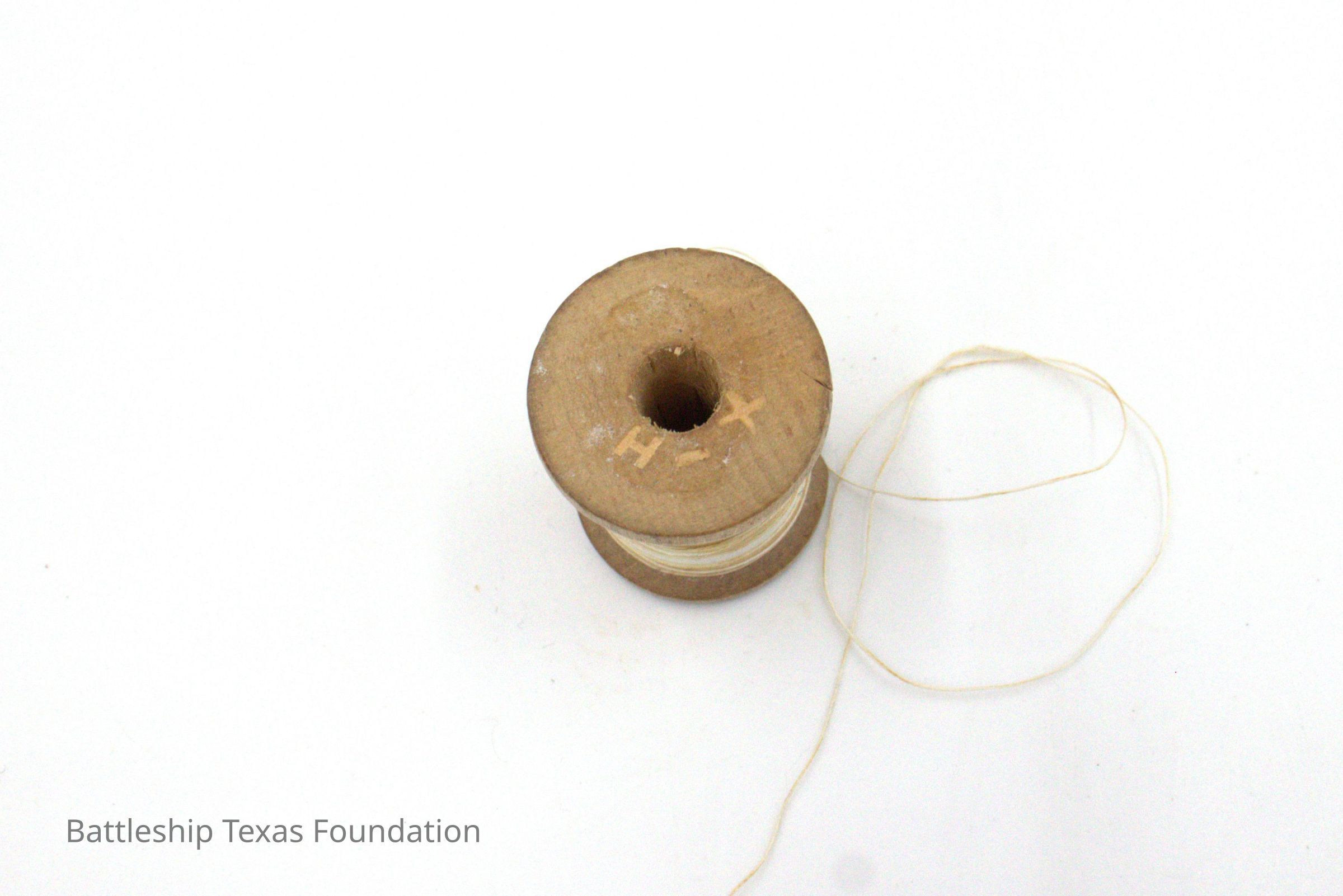 White thread, largely spent, with "H-X" on top of spool.Context