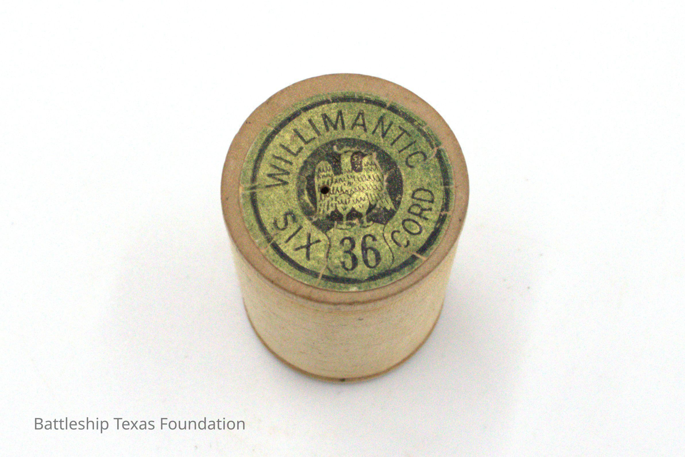 Full onused spool of white thread. "Willimantic Six (36) Cord" on top.Context