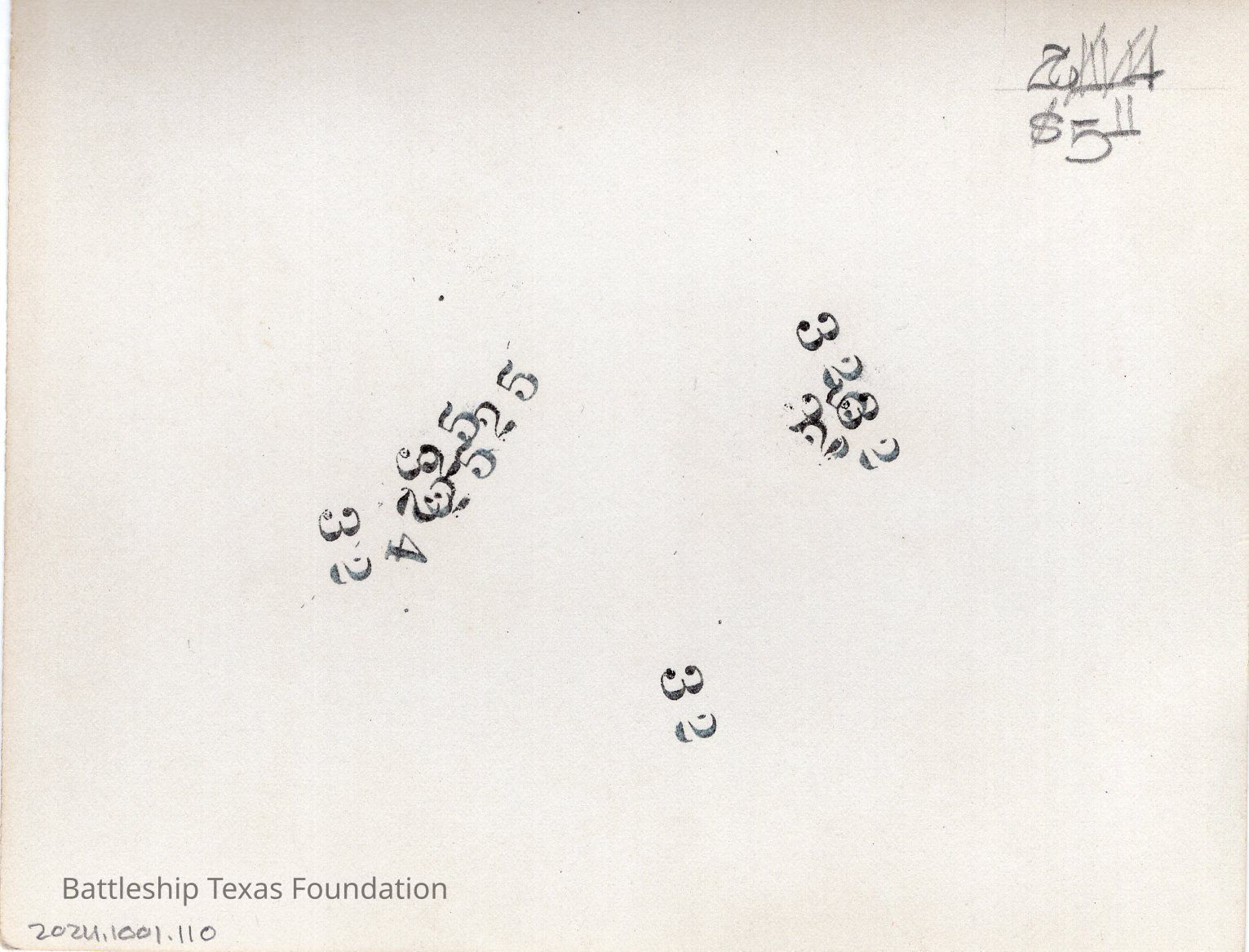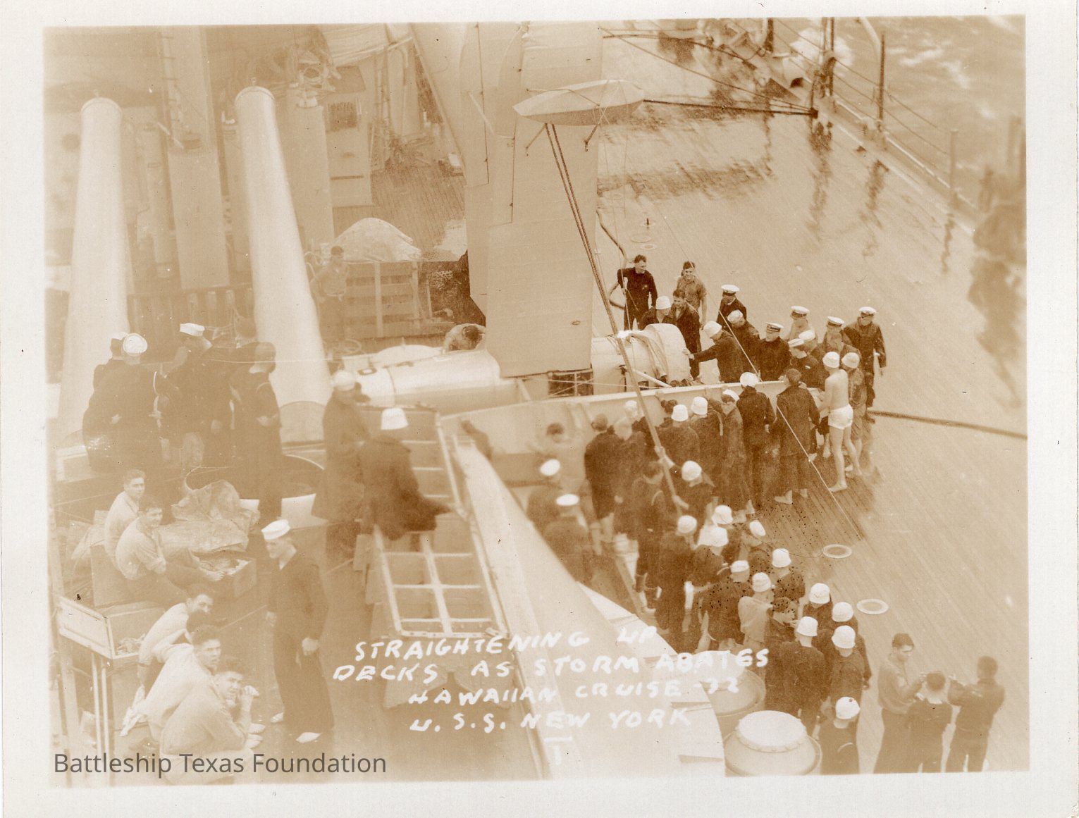 Men on and around turret. Caption reads "straightening up the decks as storm abates Hawaiian cruise - 32 U.S.S. New York"Context