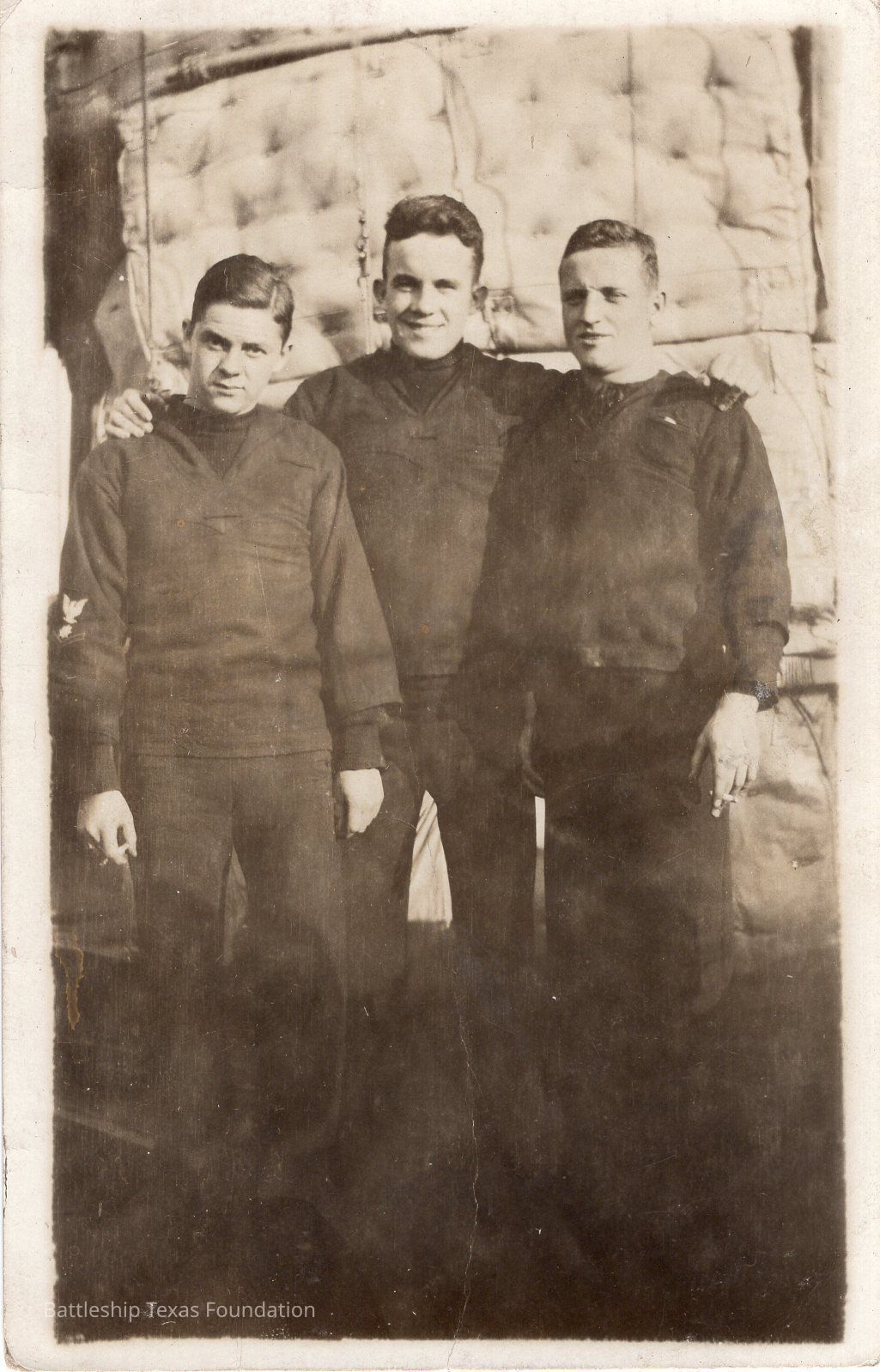 Three men, middle with arms around both. Back identifies the ship as New York in the middle of the North SeaContext