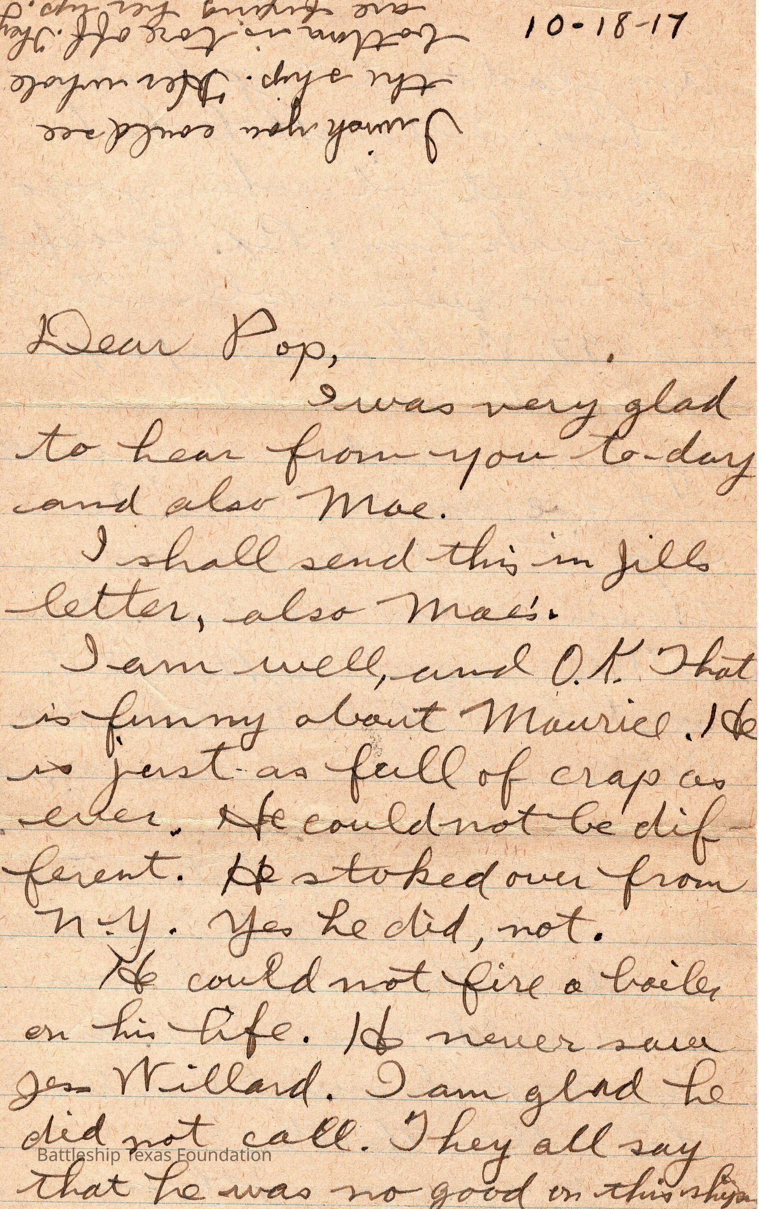 Letter dated 10-18-17 and addressed to Pop. upside down writing on top left of front page.Context