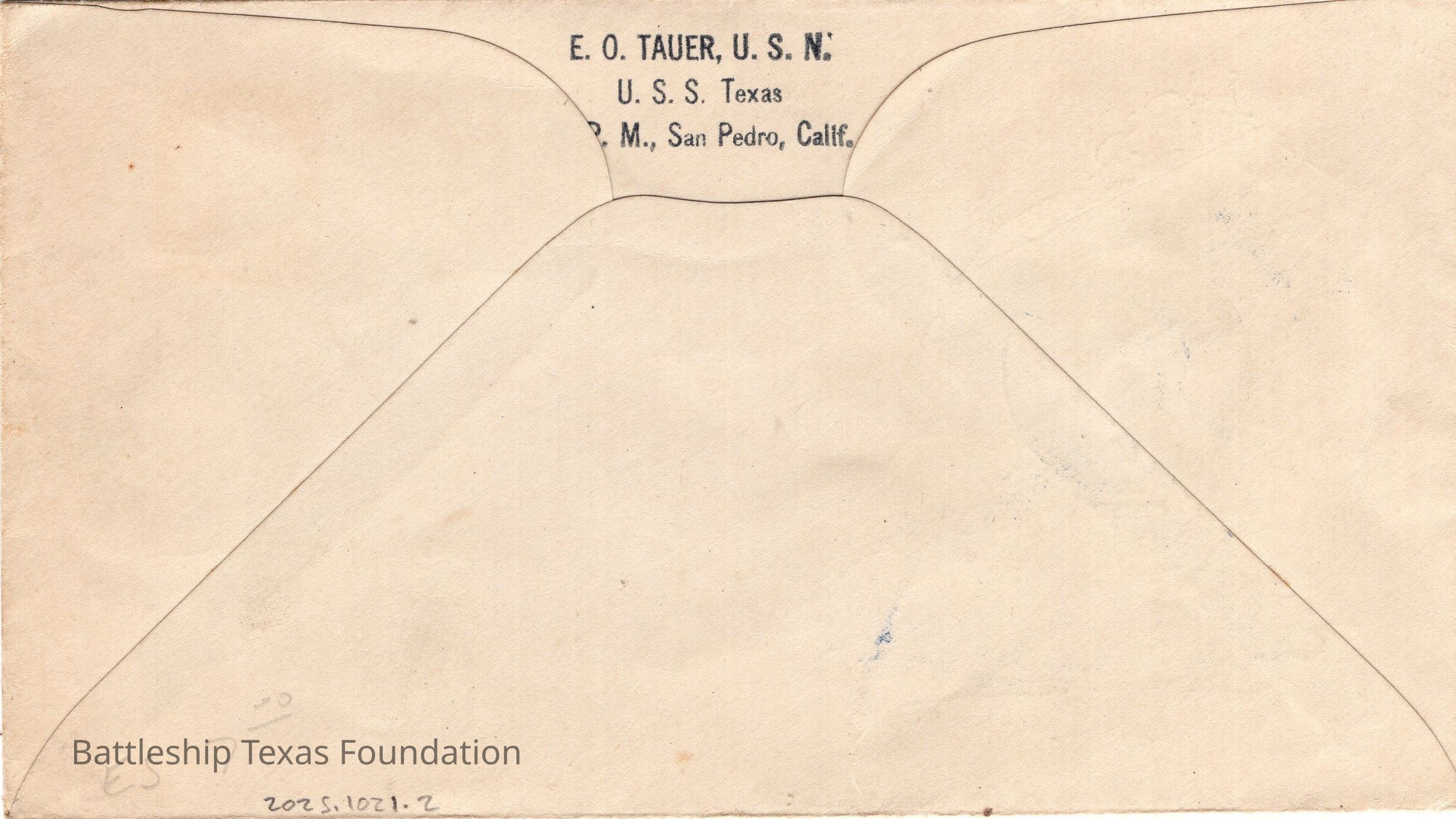 Addressed to Sam Stein from E.O. Tauer. Envelope sent from USS Texas on the morning of October 27, 1933, when the ship was in San Pedro for Navy Day. Features a Navy Day stamp with Theodore Roosevelt center, and USS Texas below, and dated to the same day as sent.Context