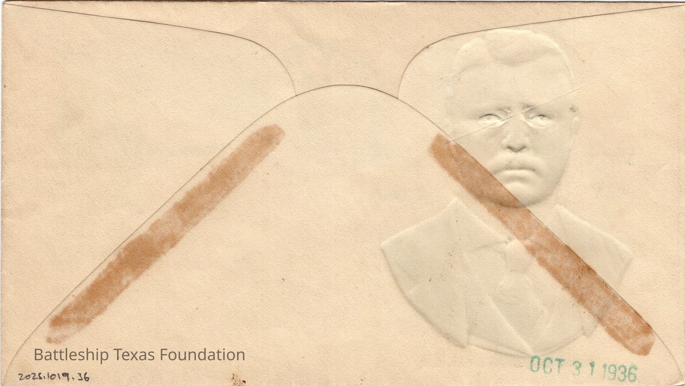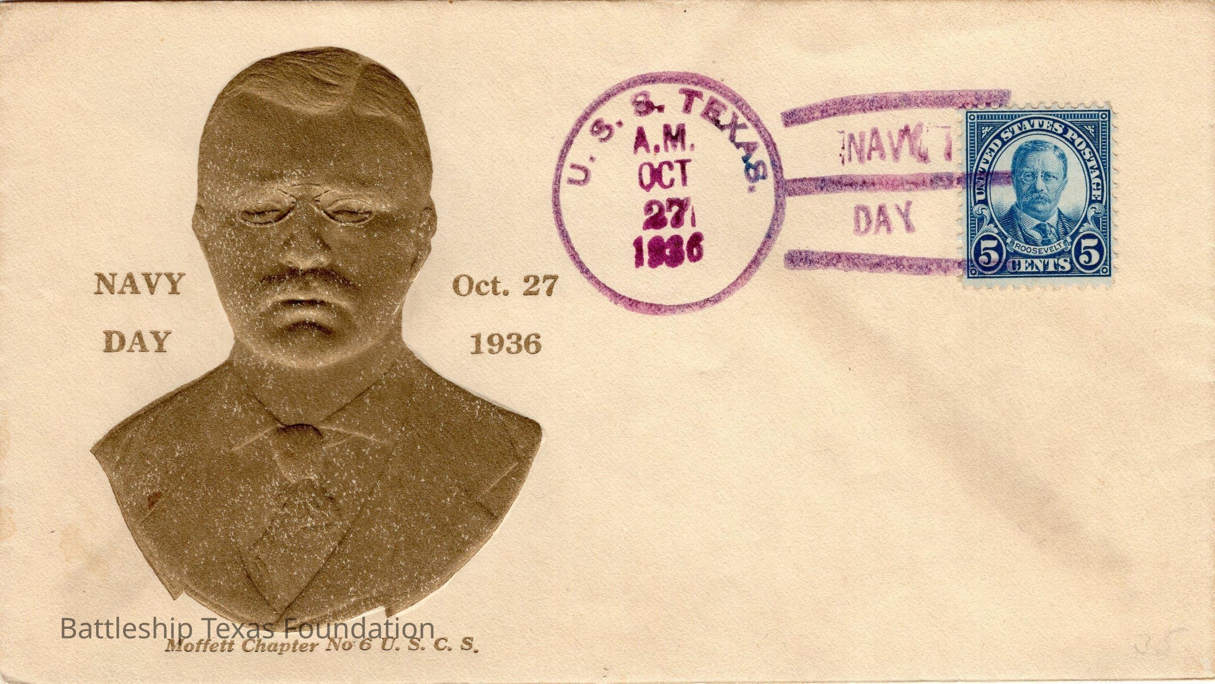 Envelope sent from USS Texas on the morning of October 27, 1936, on Navy Day. Features a large, embossed stamp of Theodore Roosevelt for Navy Day in 1936. Stamp is metallic bronze coloration and texture.Context