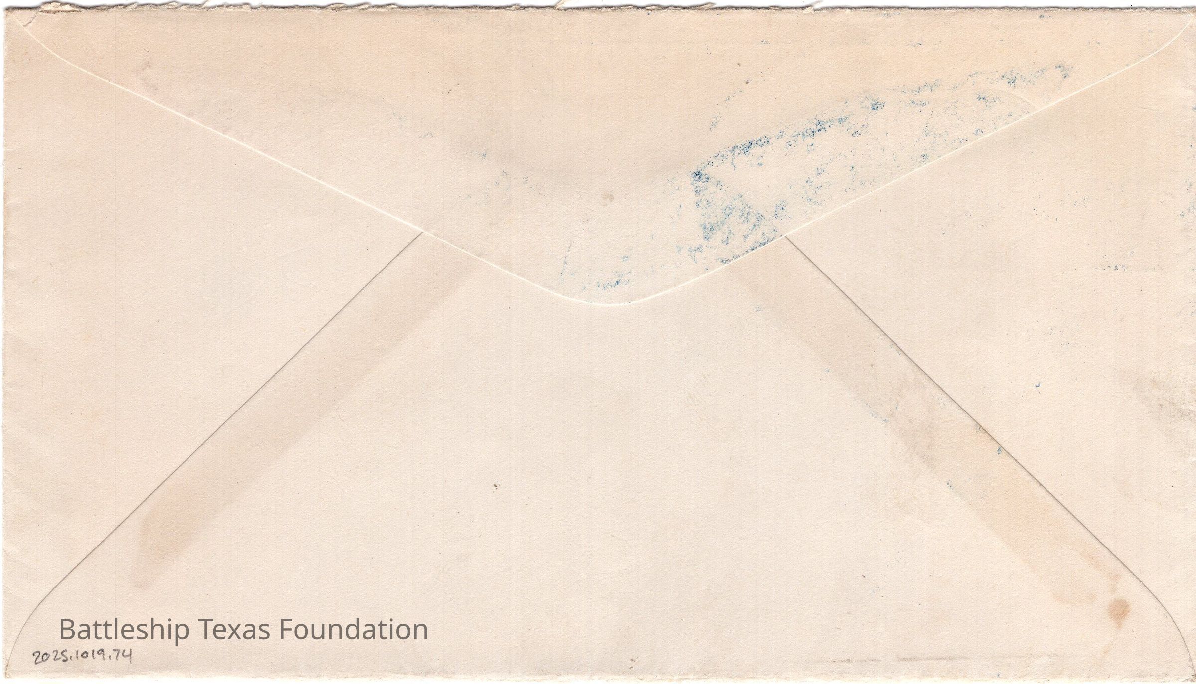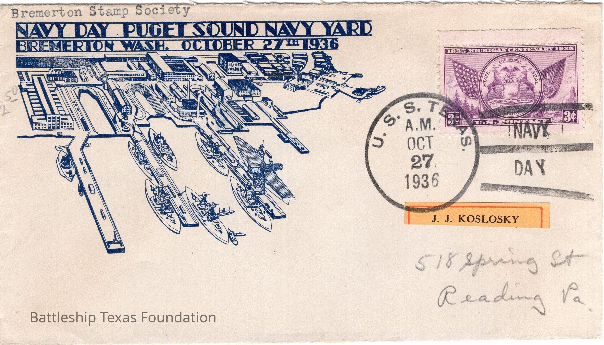 Addressed to J.J. Koslosky. Envelope sent from USS Texas on the morning on October 27, 1936, when the ship was in Bremerton, Washington for Navy Day. Features a large stamp of several piers mooring battleships, smaller vessels, and an aircraft carrier.Context