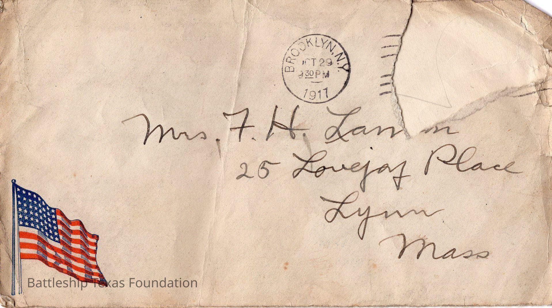 Stamped "BROOKLYN, NY OCT 29 930PM 1917" with an American flag in the bottom left corner. Envelope from Young Men's Christian Association.Context