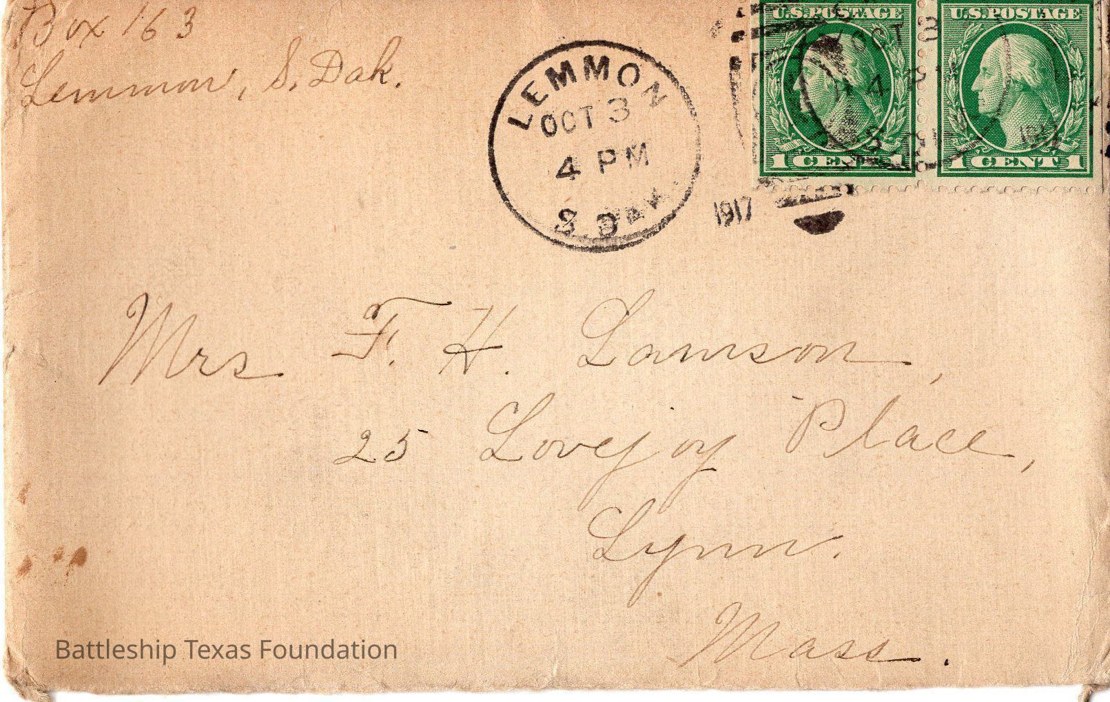 Letter sent from South Dakota, rather than U.S.S. Texas. Two green Washington stamp. to Mrs. LamsonContext