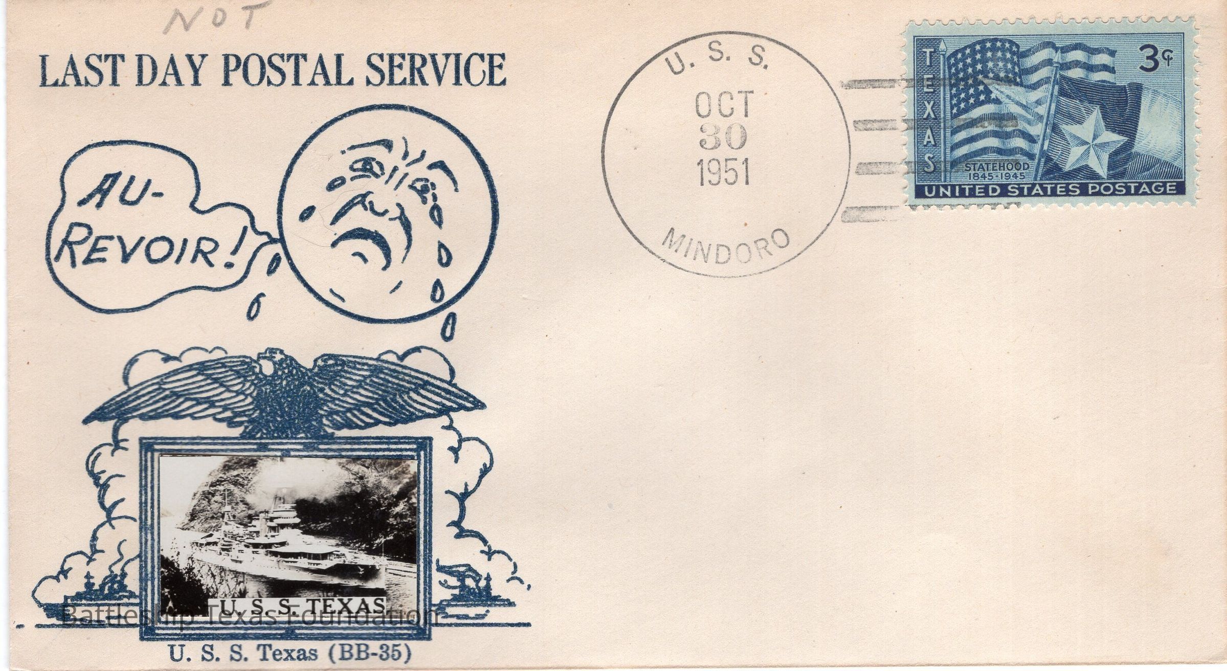 Envelope sent from USS Mindoro on October 30, 1951. The stamp features an image of USS Texas going through the Panama Canal.Context
