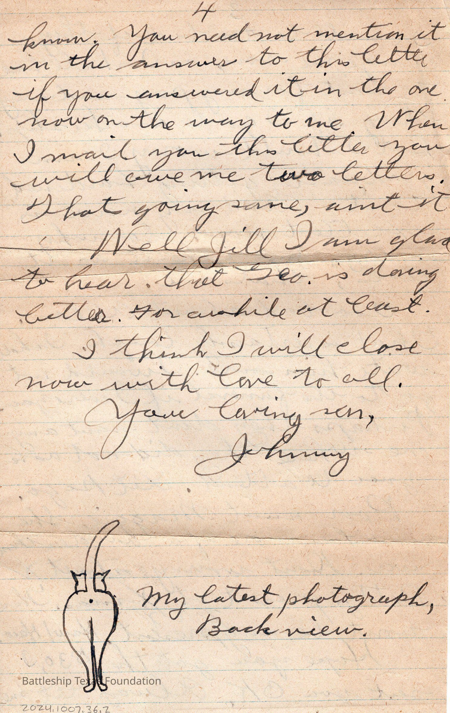 3rd and 4th pages of 10-9-17 letter. 3 and 4 on top of each page. Cat on back side of page, accompanied with caption "my latest photograph, Back view"Context