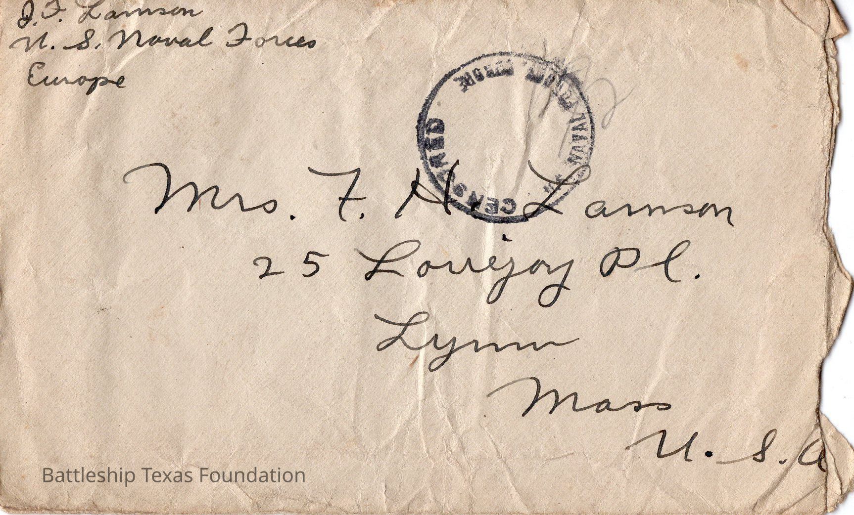 Slightly crumpled envelope stamped "CENSORED U.S. NAVAL FORCES. EUROPE"Context