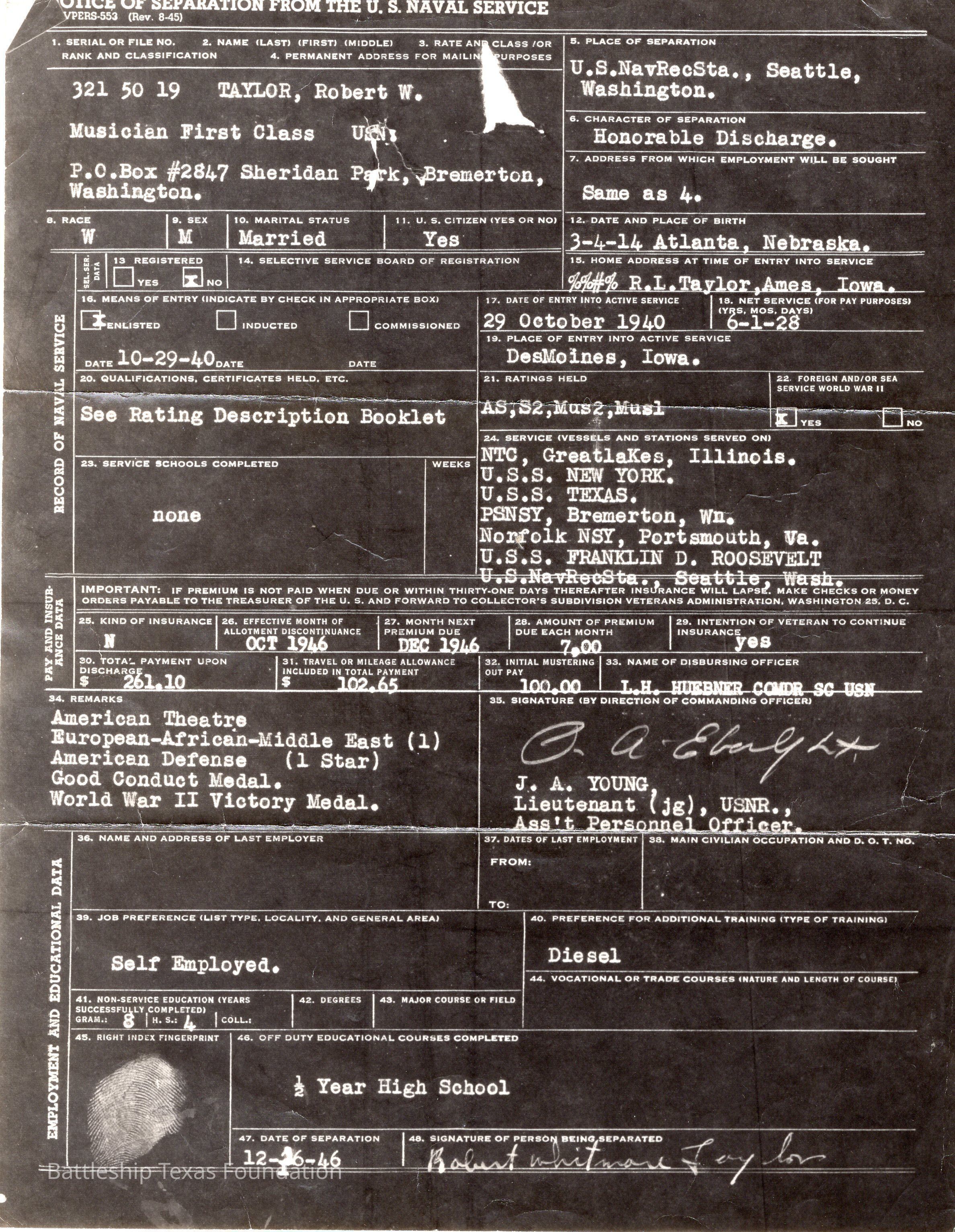 Robert Taylor served on both Battleship Texas, and her sister ship Battleship New York. He was a M1c and played the trumpet on both ships from late 1940 to July 1943, and elsewhere until his discharge in 1946.
