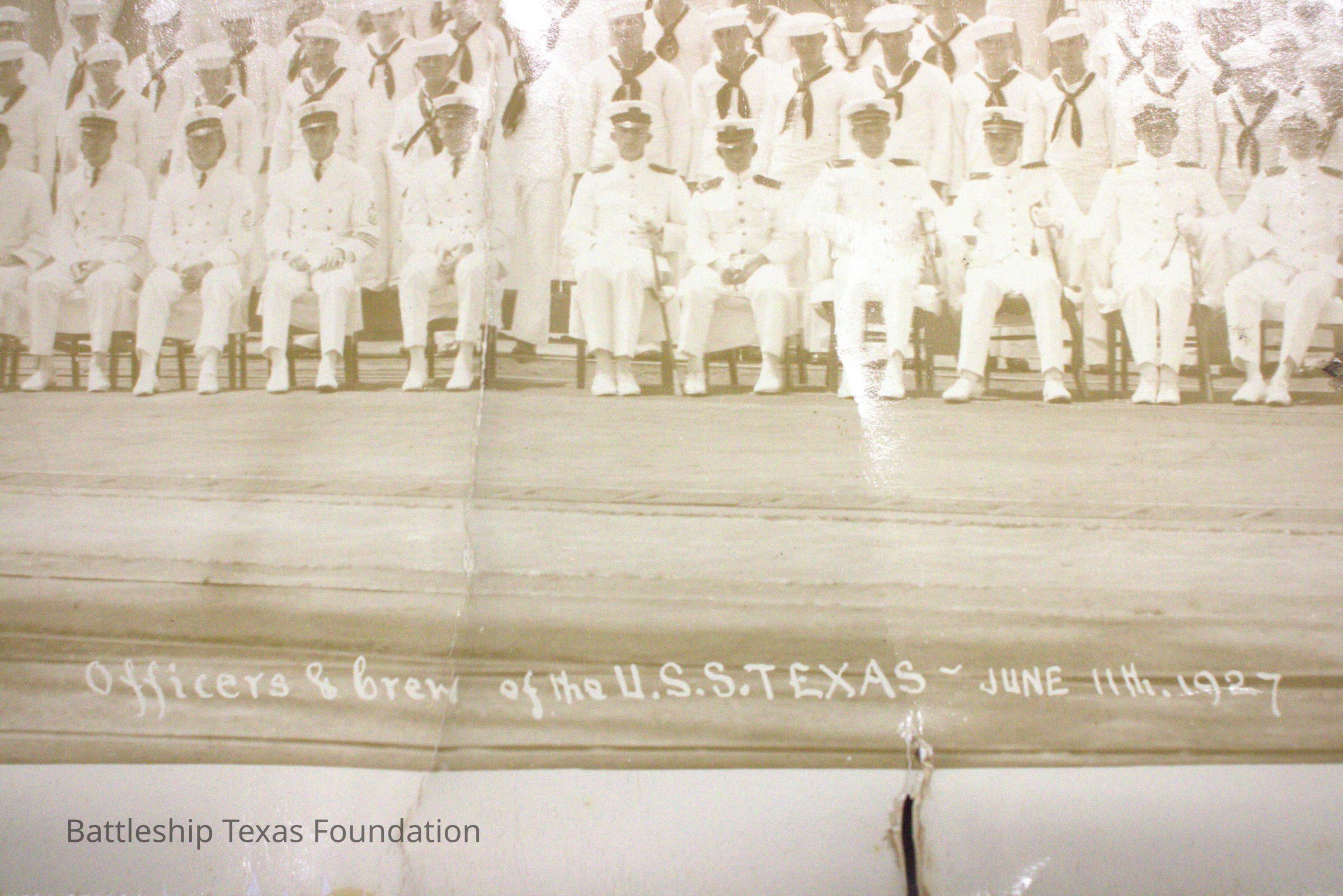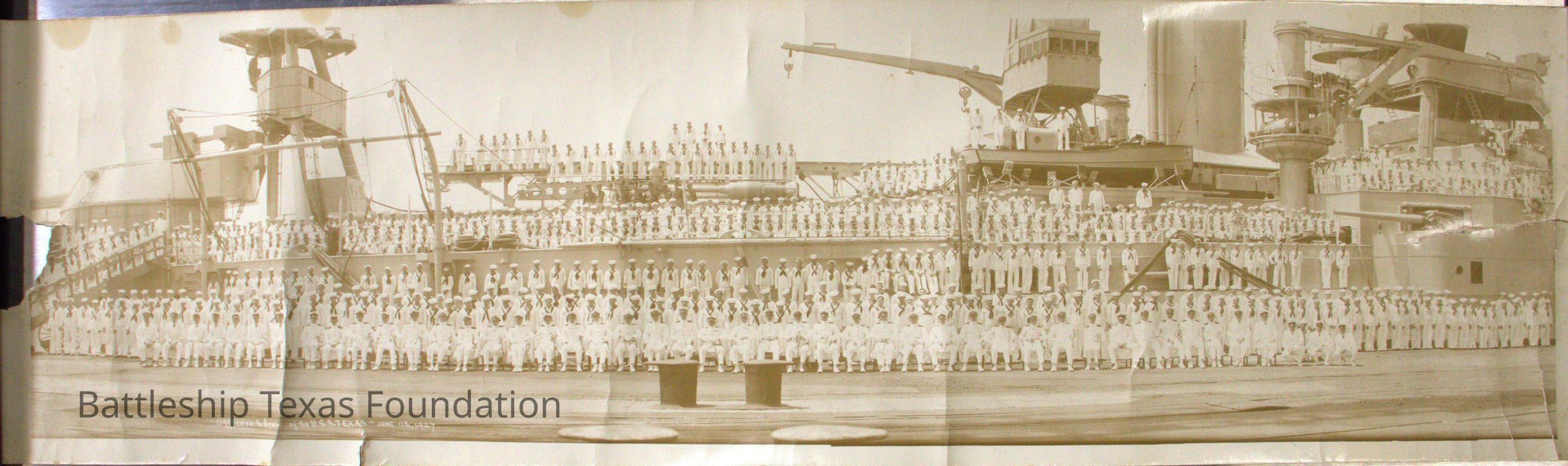 Panoramic photograph of the officers and crew of USS Texas on June 11, 1927. Sailors line pier and starboard side of the deck. Significant portion missing from the left side, and a large tear on the right. Photo donated by Gary A. Clark, husband to the descendent of the original owner.Context