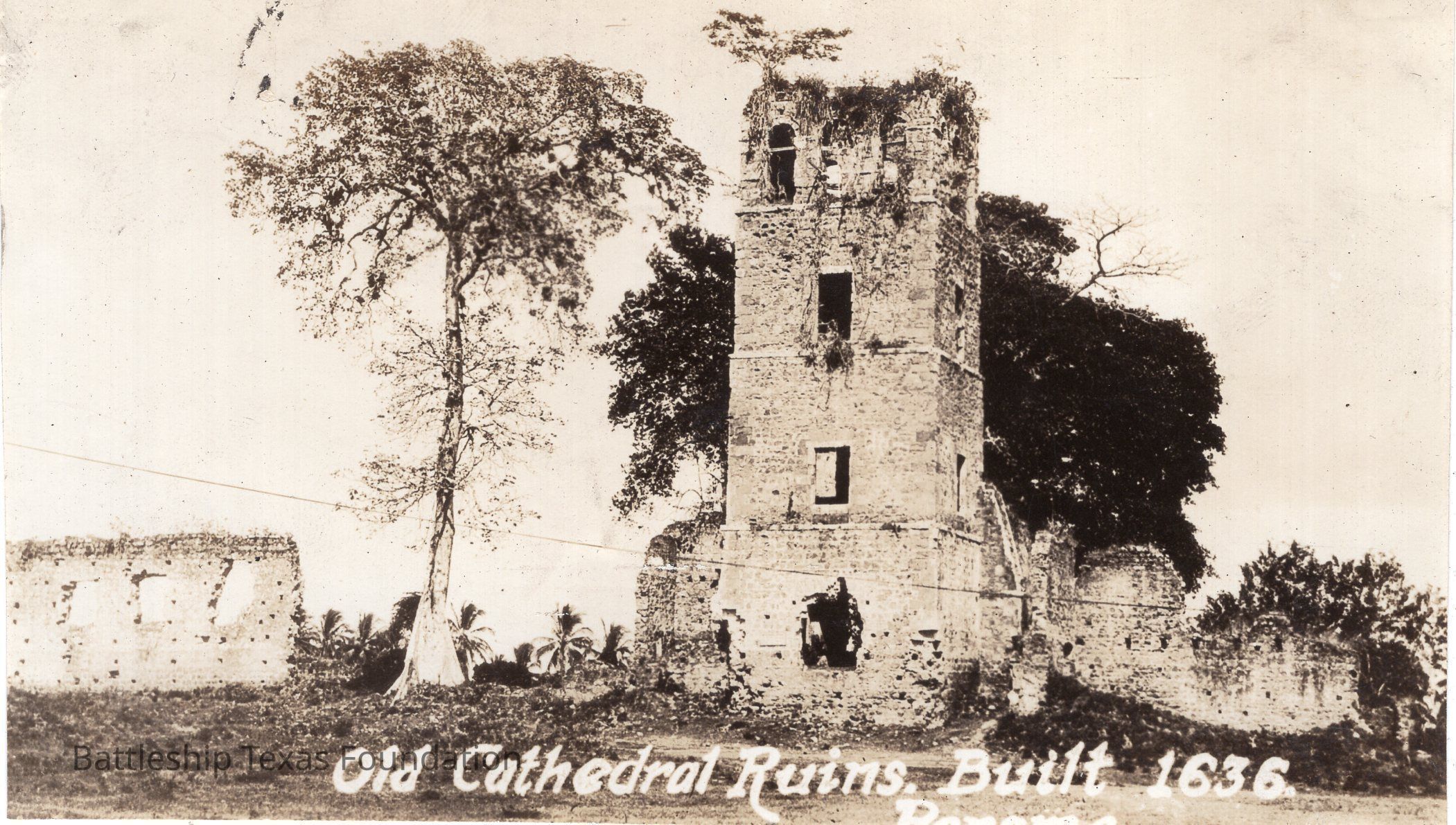 Features ruins of 17th century cathedral in Panama.Context