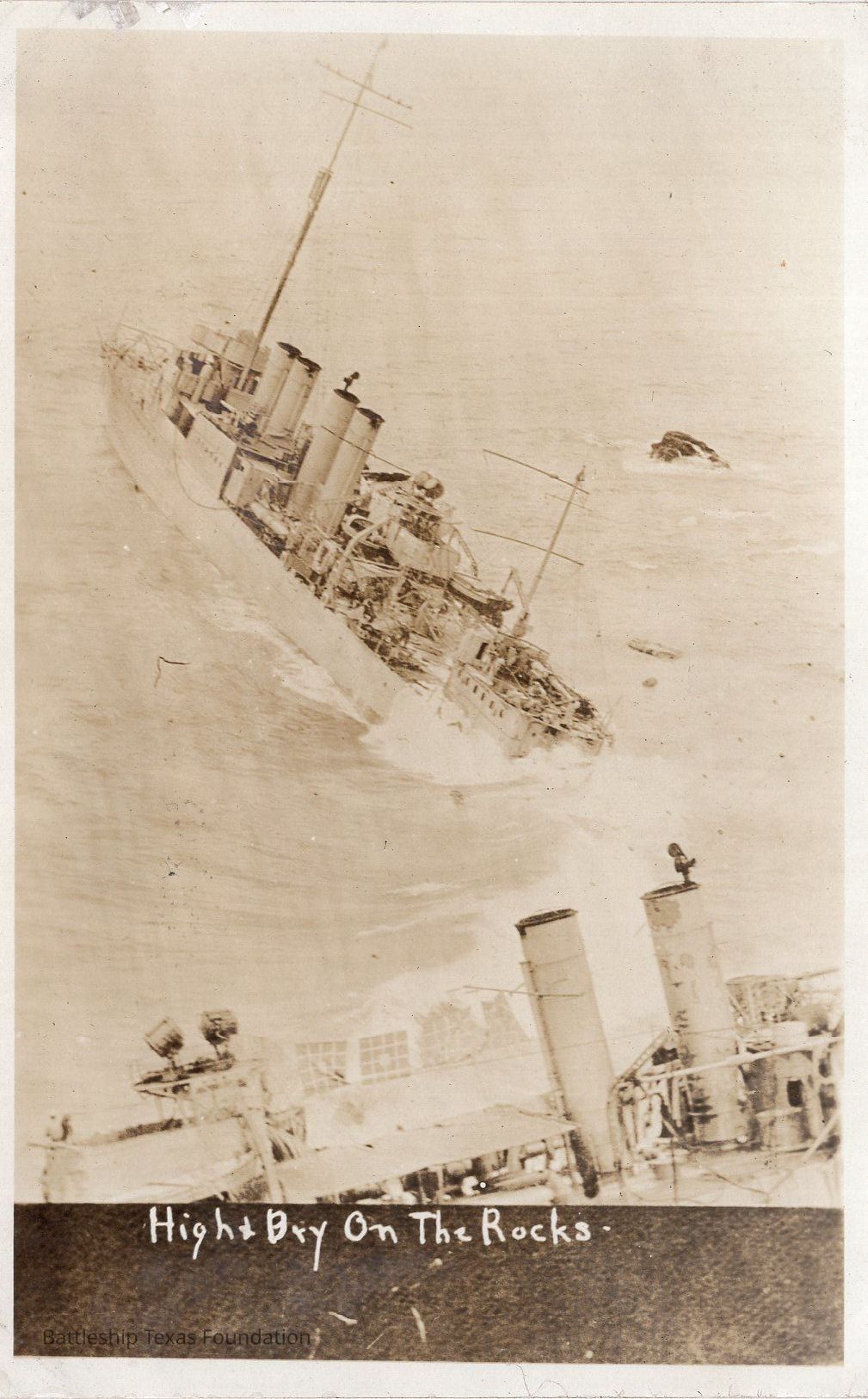 Features smaller four stack ship stuck upon shore rocks. Ship has significant starboard list.Context