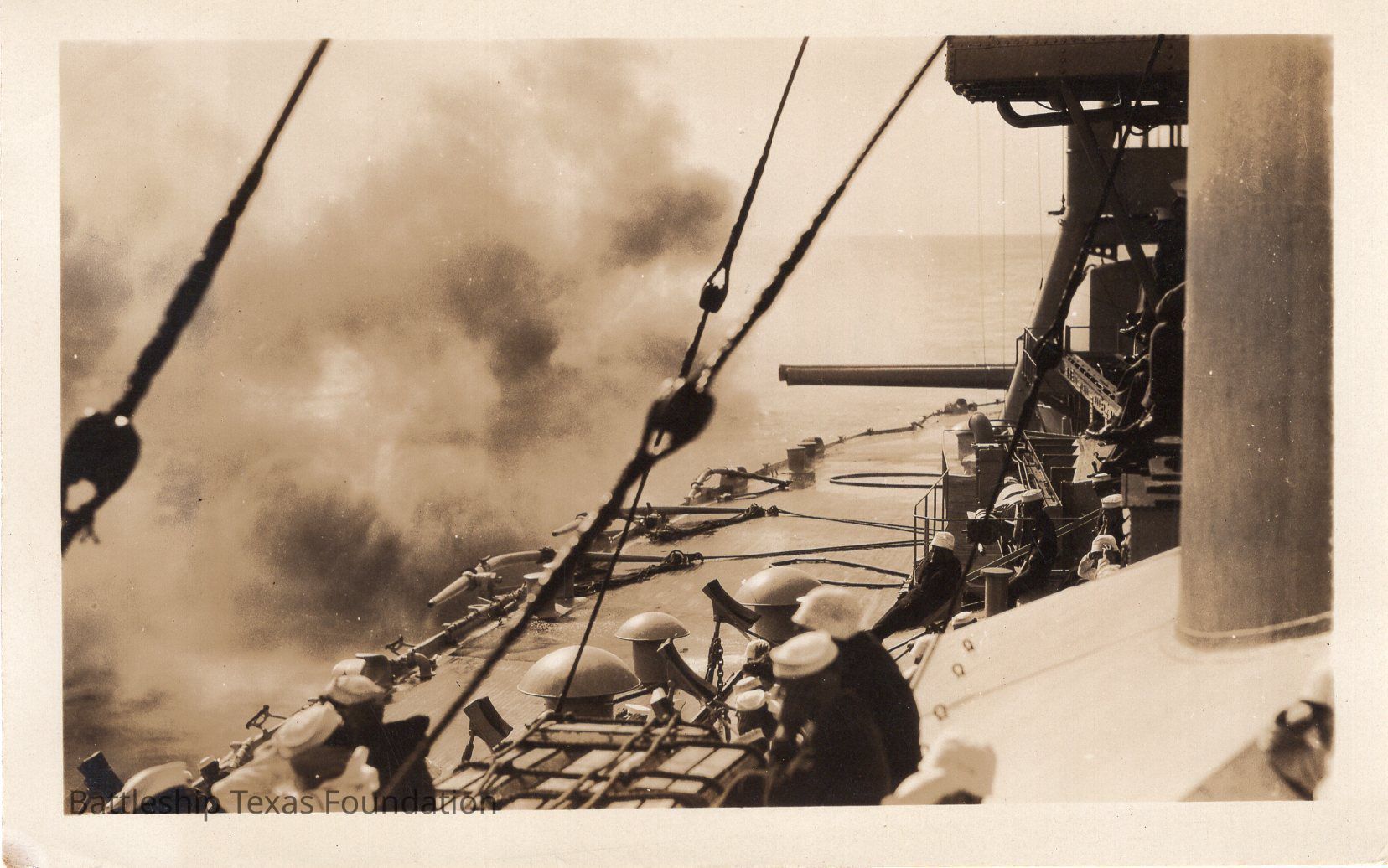 Ship turret firing to the left. Gun smoke takes up left side of photo.