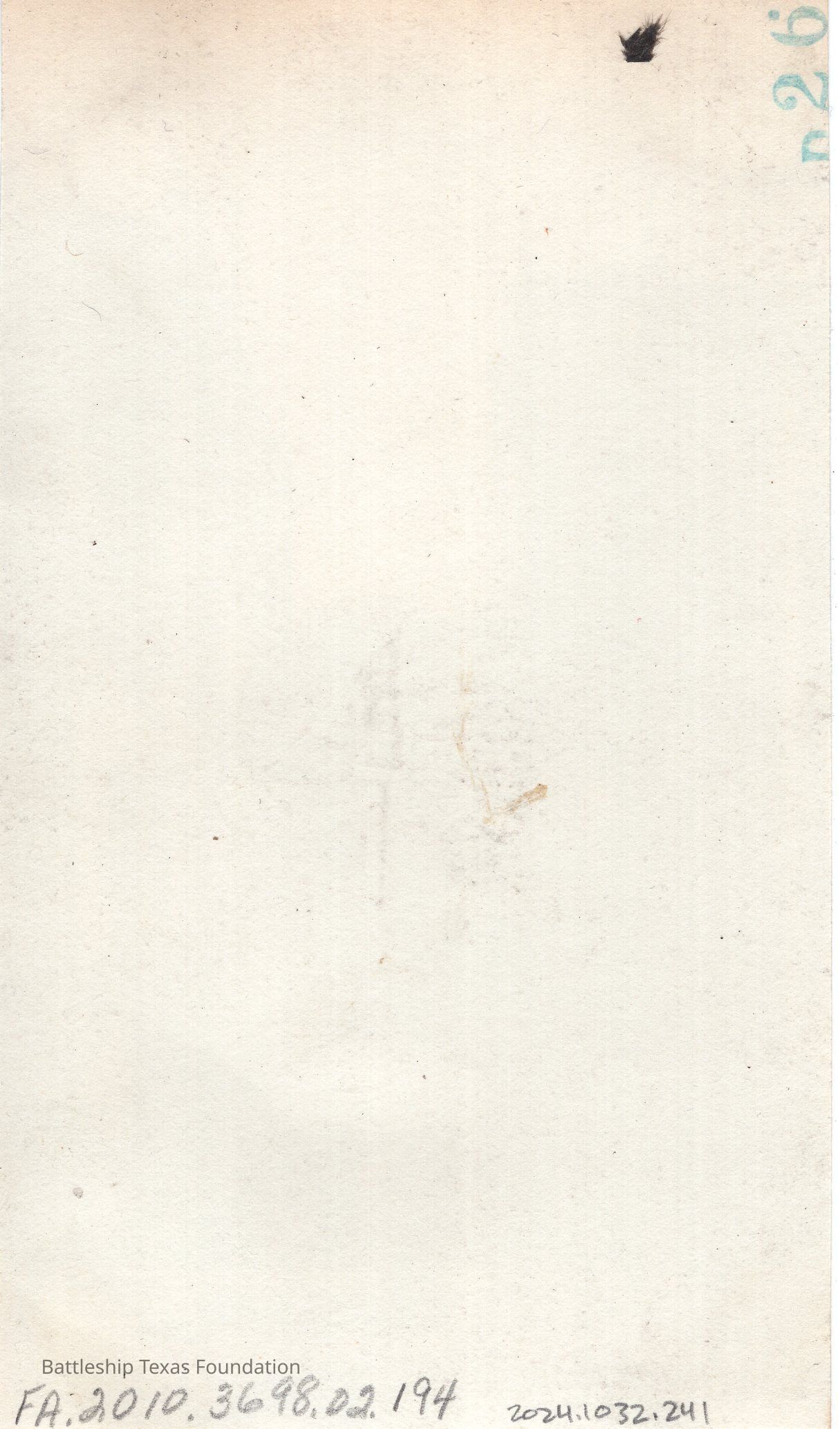 From a donated collection of individual photographs and pages out of a Texas crewmember's photo album. Items donated by the Los Angeles Maritime Museum.