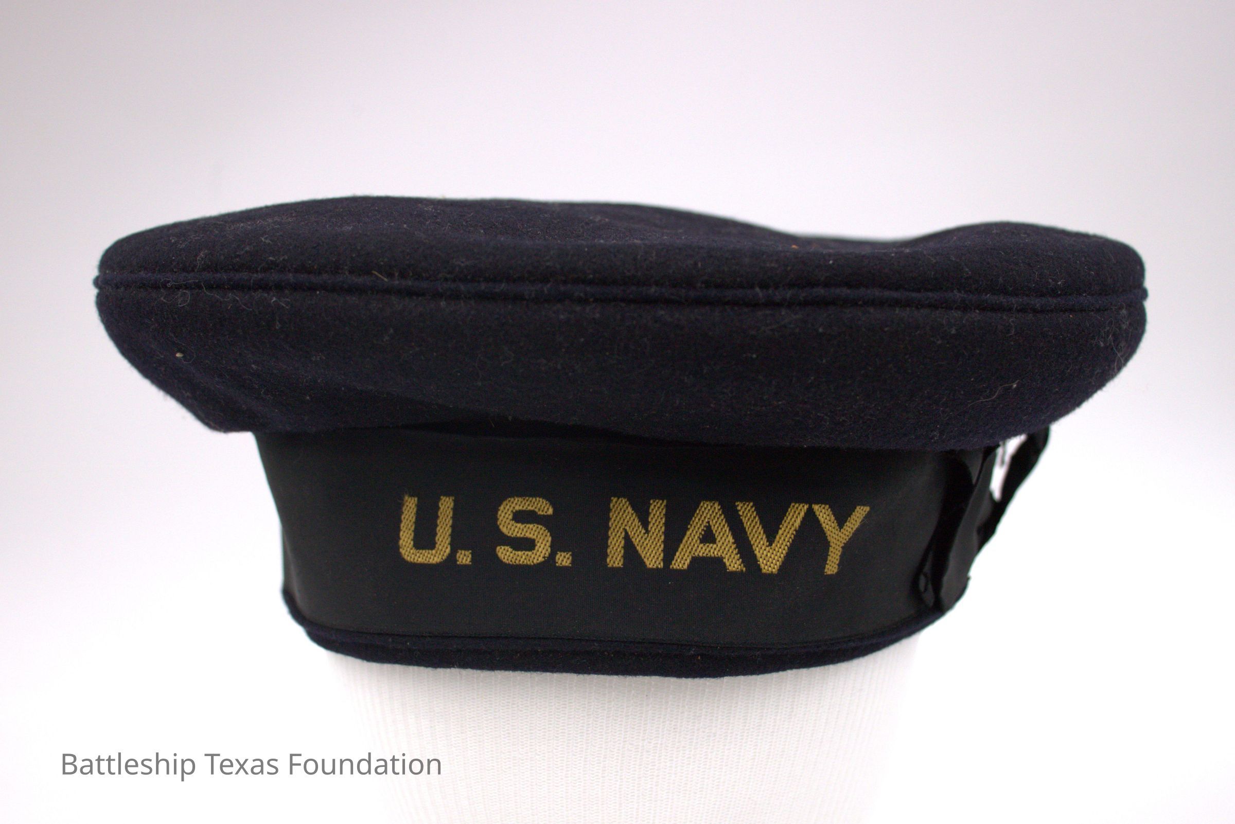 Flattopped hat with "U.S. NAVY" on front and bow on the side.Context