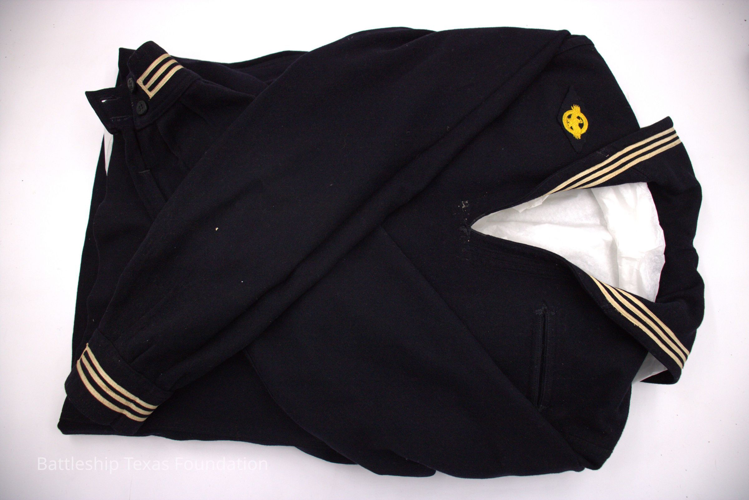 Dress Blues were the standard uniform for the enlisted sailor in the Navy, and included a jumper, trousers, white hat, and blue cap. Patches denoting sailor rate were on their right arm. Sailors also received handkerchiefs, socks, and many other articles.Collection