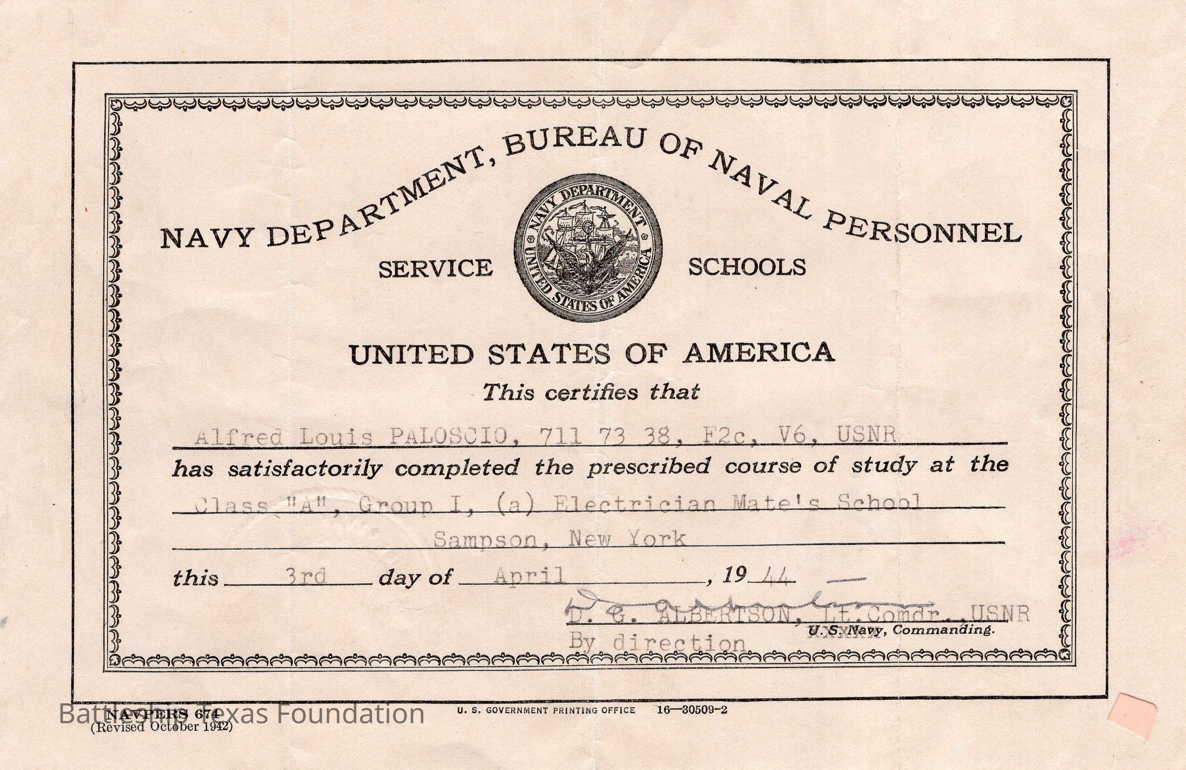 certifying Paloscio finished Electrician Mate's SchoolContext