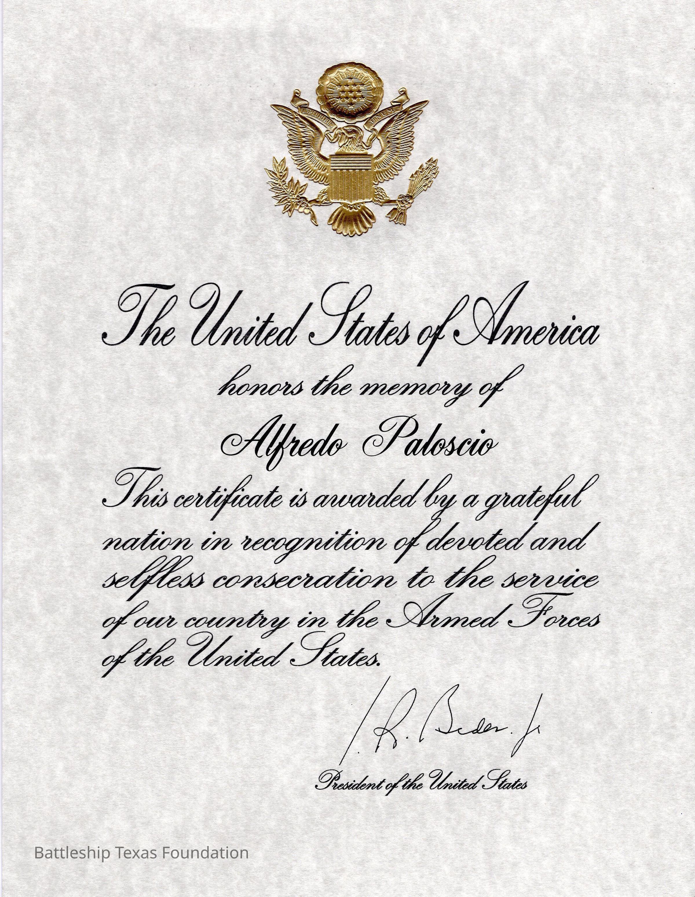 Alfredo Paloscio was a F1c on Battleship Texas from October 1943 to April 1946. He continued to support Battleship Texas and visit her as a museum until his death in 2022.