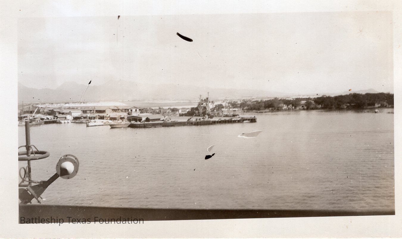 Ship moored at a pier in background. Water in foreground. Texas antenna bottom left.Context