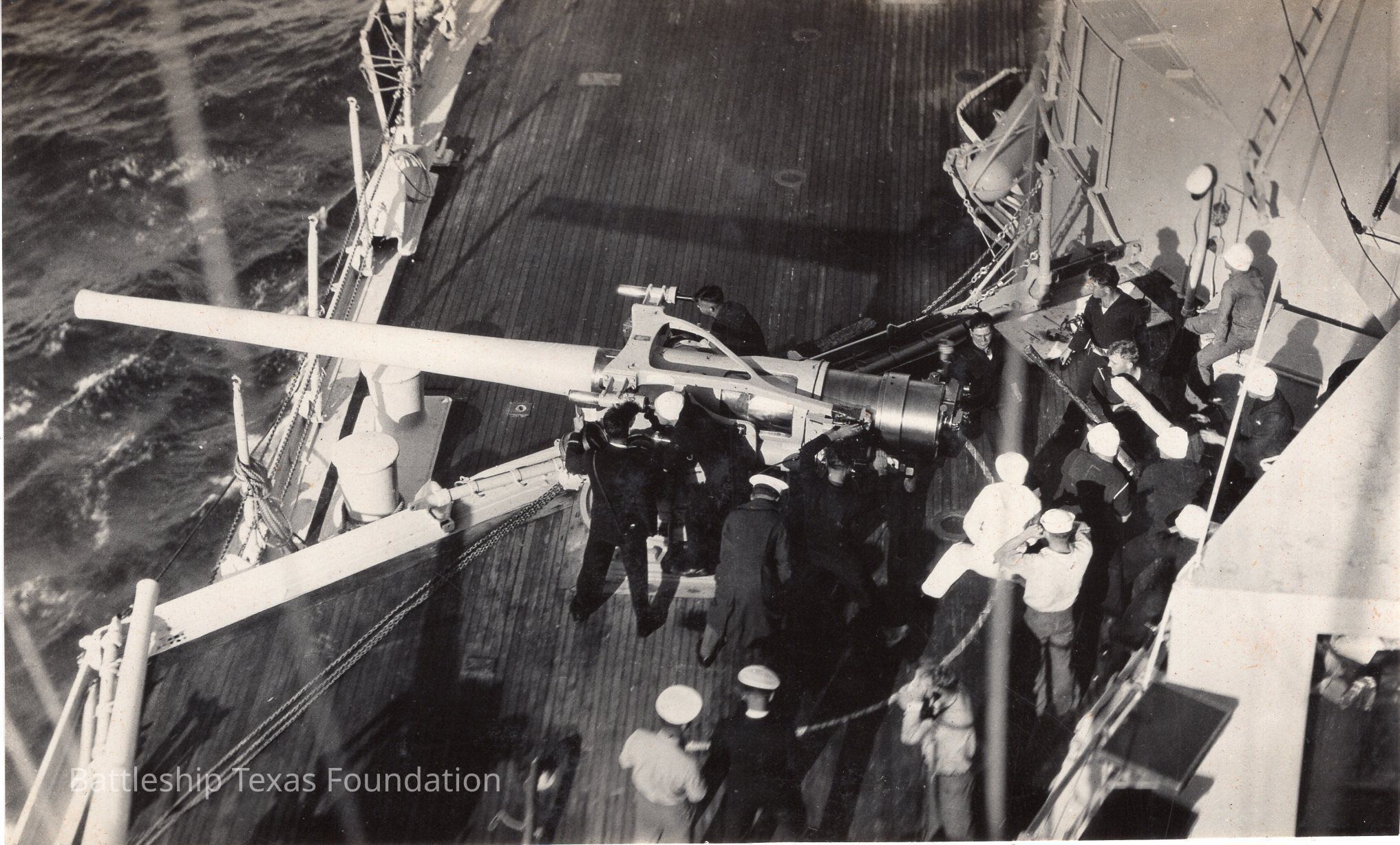 Features a group of over a dozen men standing behind the breech of the portside 01 superstructure deck 5"/51cal gun.Context