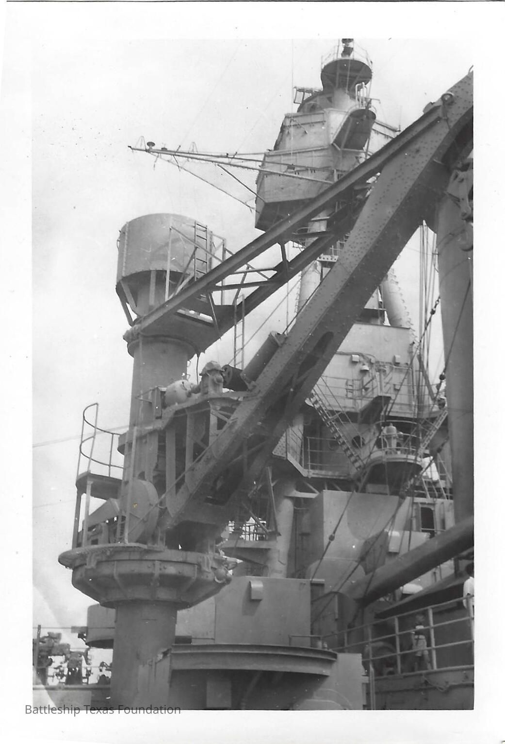 Post 1948 B&W photograph of aft side of port crane and foremast, Battleship TexasContext