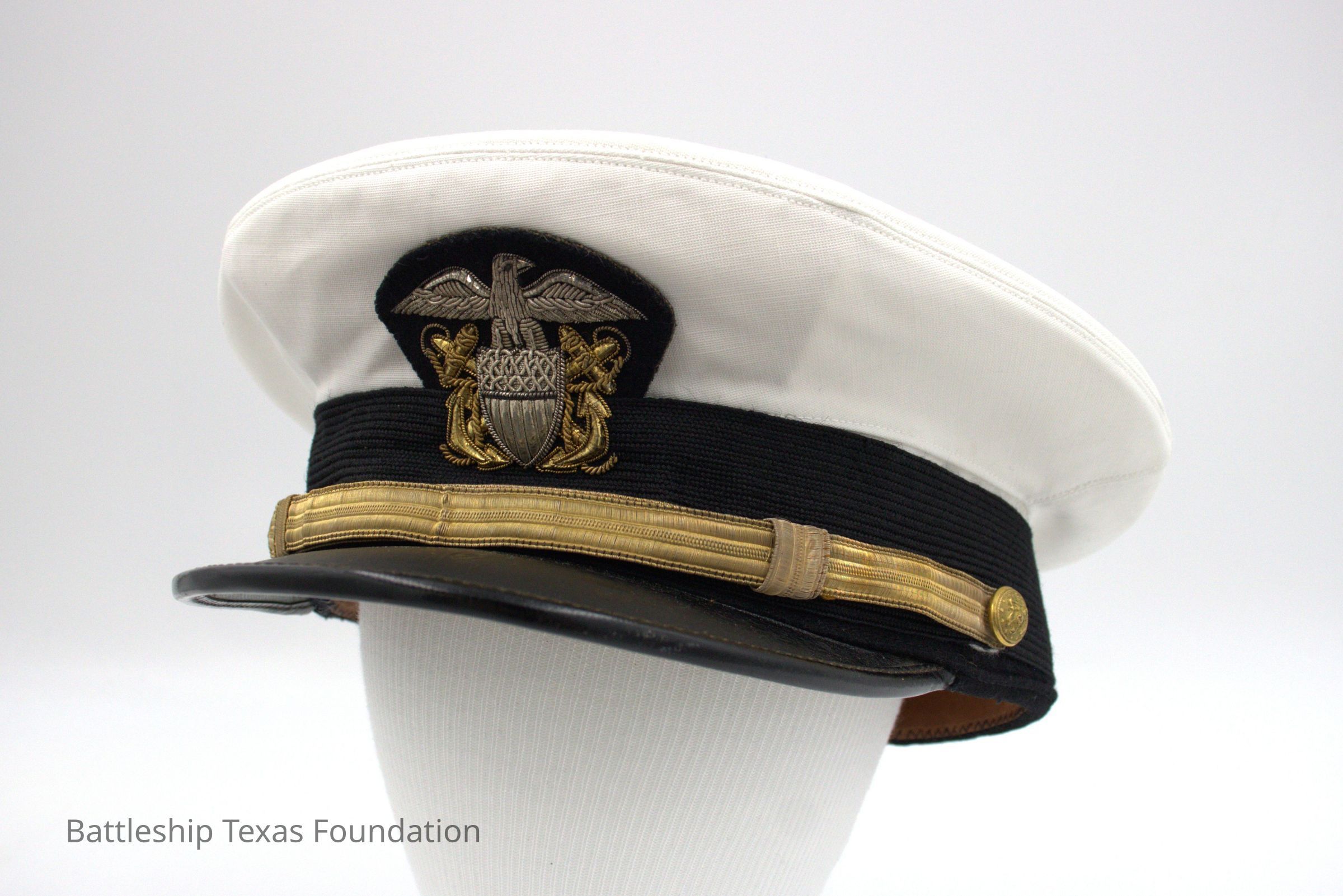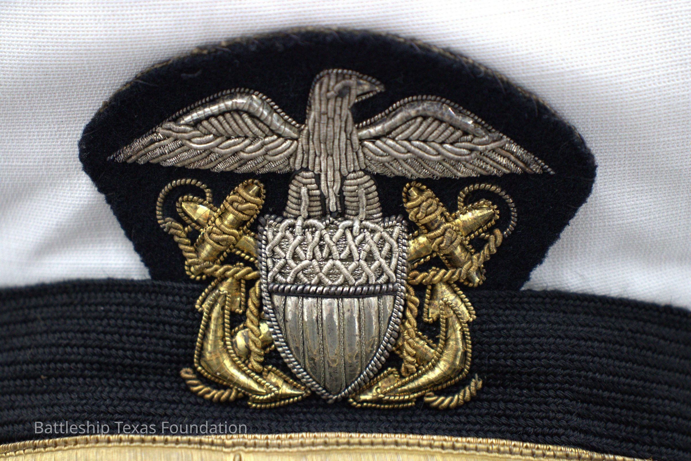 White hat with a black brim and bill in the front. Eagle on top of shield with two fouled anchors on front. Bullion and gold silk used throughout.