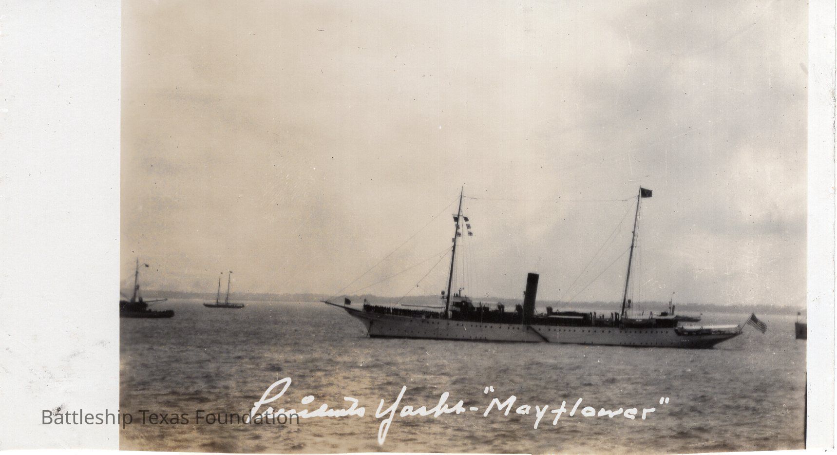 Photo shows steel hulled ship sailing to left of photo. Smaller craft in background. Captioned "Private Yacht- 'Mayflower'"Context