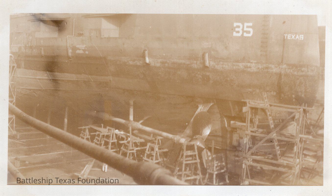 Texas stern. Pipe railing in foreground. "35" and "TEXAS" visible on stern with scaffolding tower underneath.Context