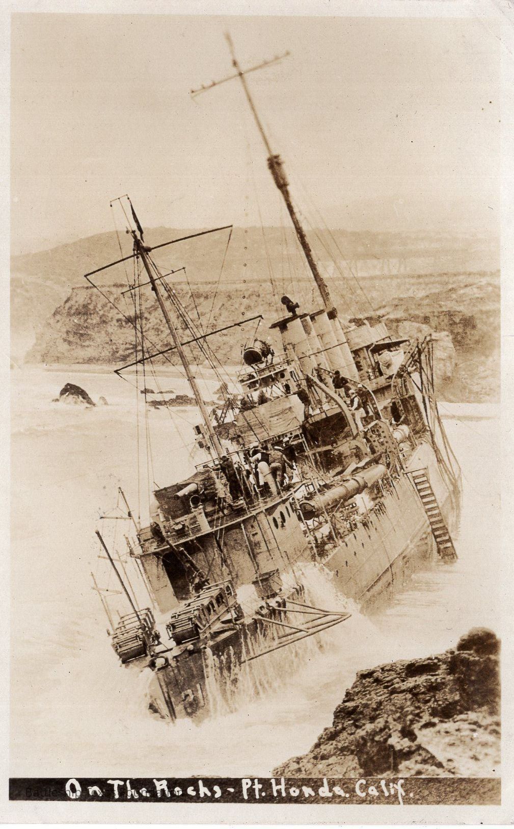 “On the rocks at Pt. Honda Balif.” Which is the same caption as the preceding photograph. Features smaller four stack ship stuck upon shore rocks. Ship has significant port side list.Context