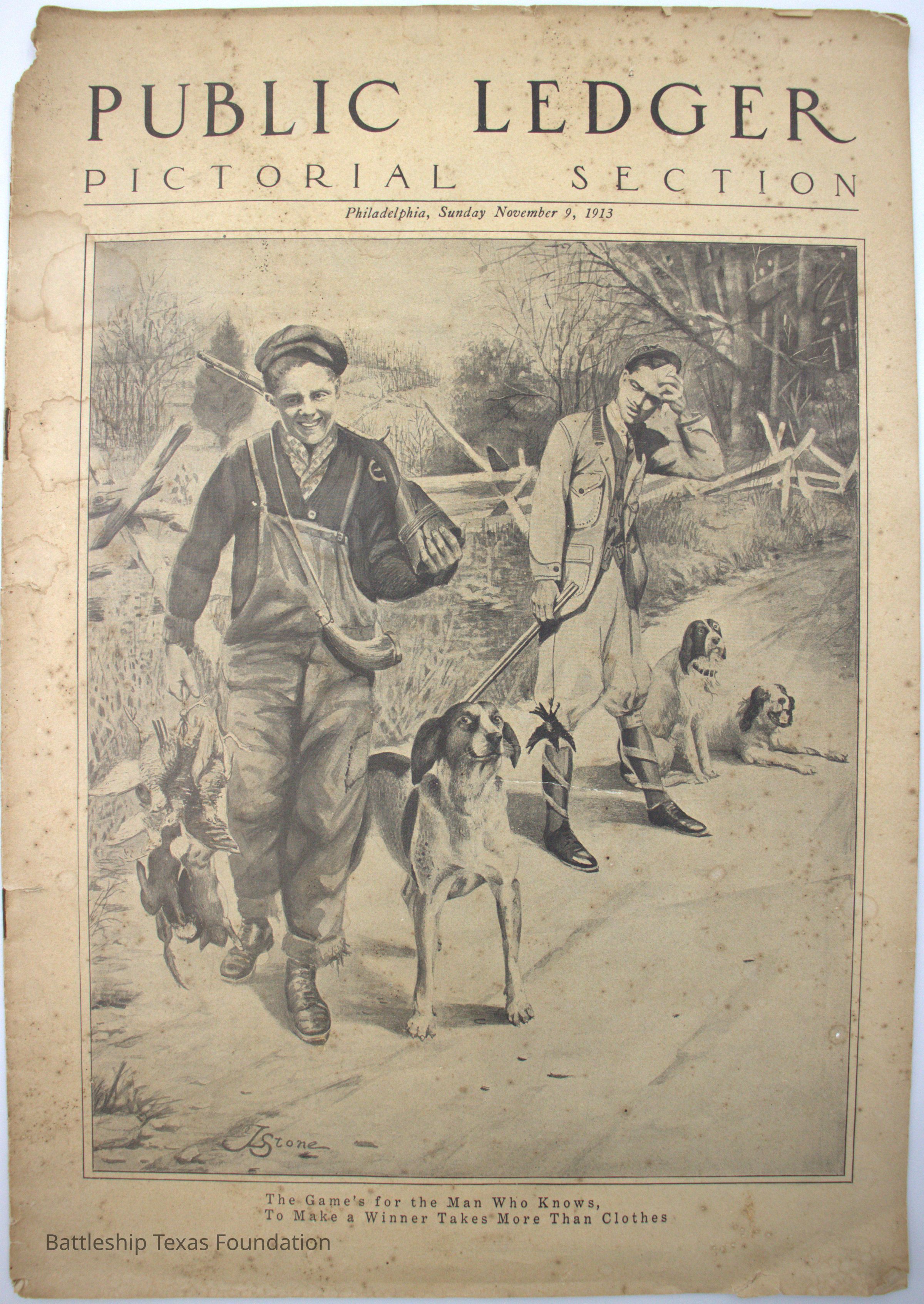 Sunday, November 9, 1913, issue of the Public Ledger: Pictorial Section published out of Philadelphia, Pennsylvania. Cover shows image of two men bird hunting with three dogs. Third page shows Texas featured prominently along another British battleship.Context