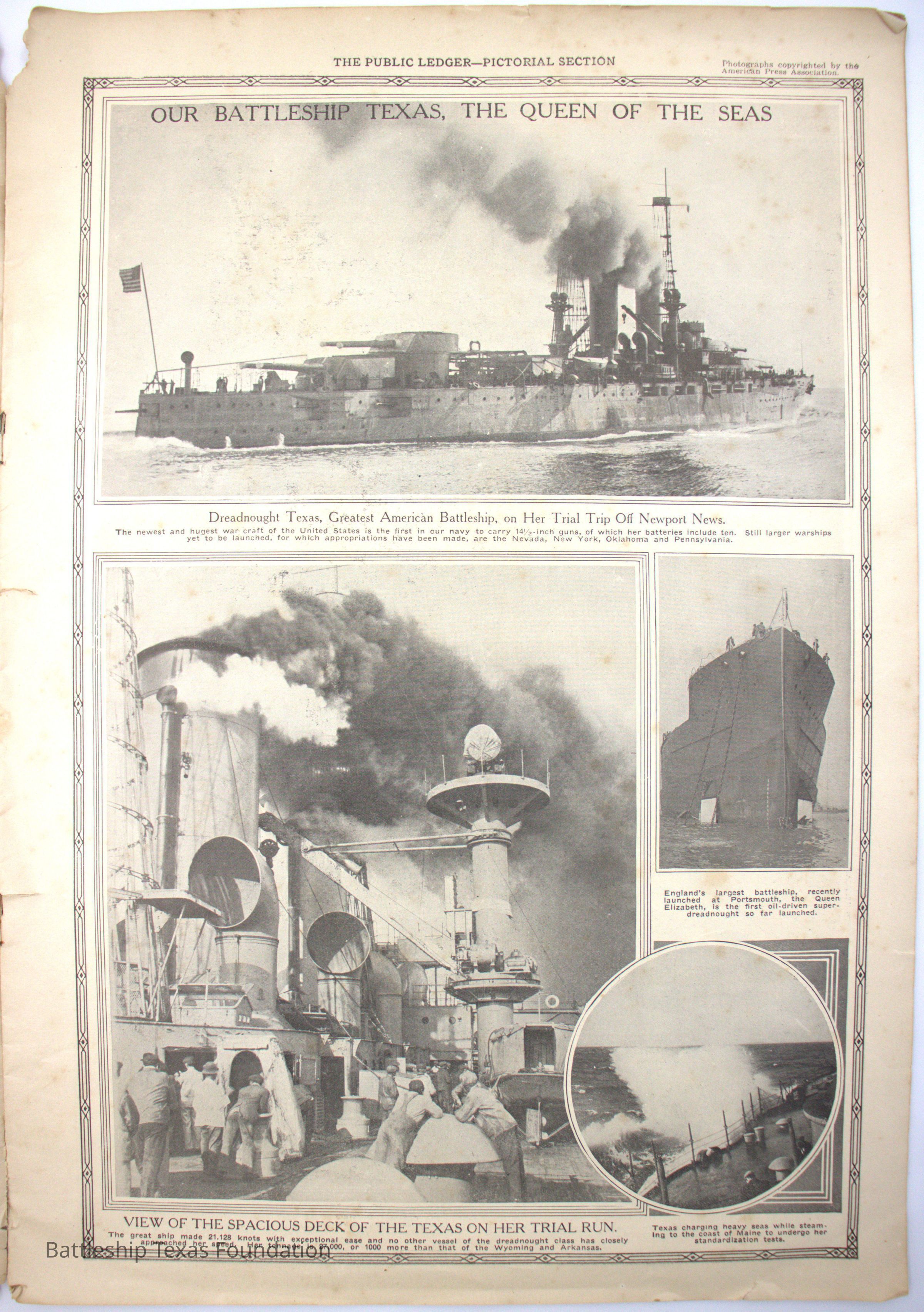 Newspapers often wrote stories about Battleship Texas and her crew. While sometimes inaccurate or sensational, they showed the perceptions of the Homefront, and were collected by civilian and crew alike.Collection