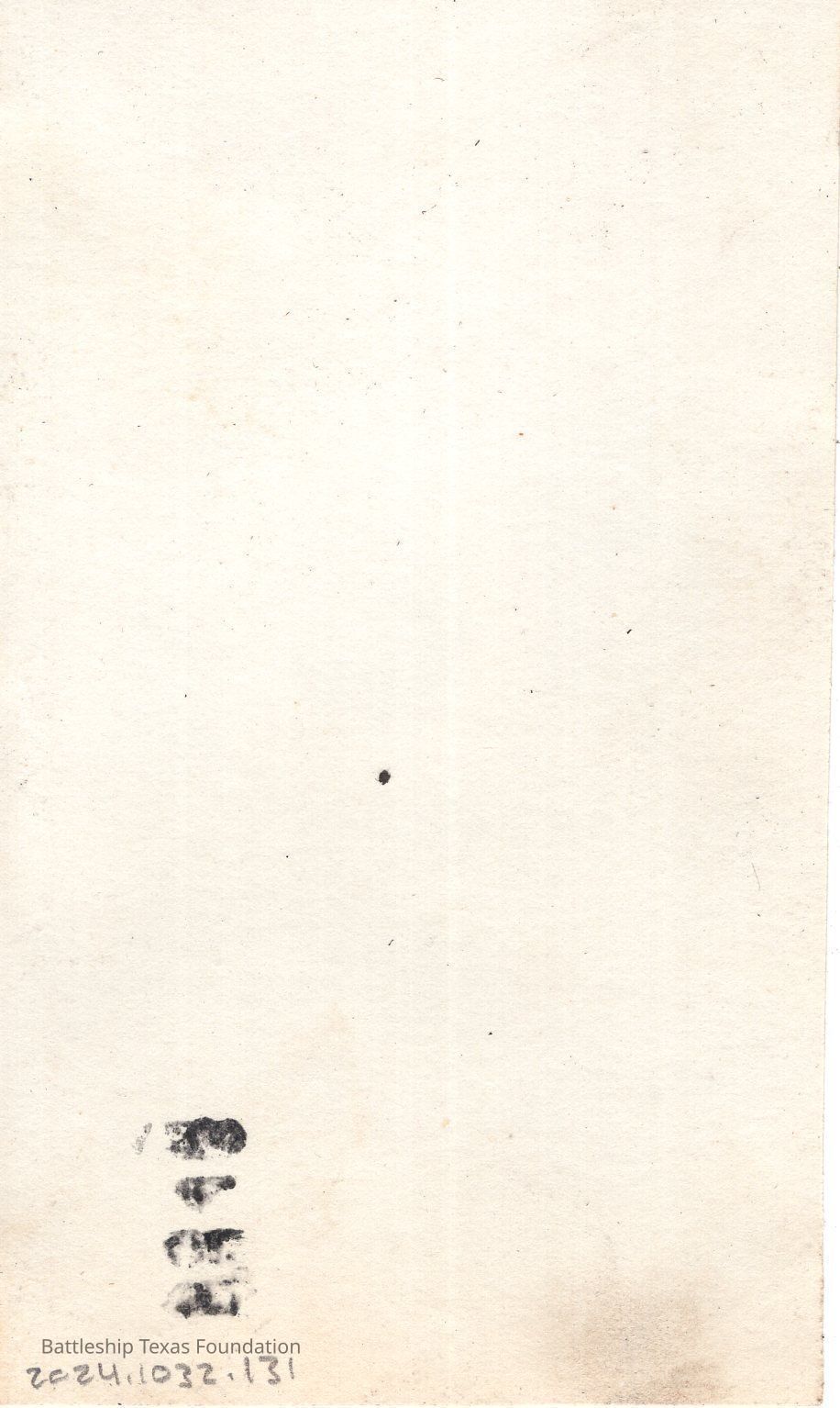 From a donated collection of individual photographs and pages out of a Texas crewmember's photo album. Items donated by the Los Angeles Maritime Museum. Many photographs had writing on the pages of the book, now discarded. The caption formerly on the page for this photo read, "R.A.G. AthERToNContext