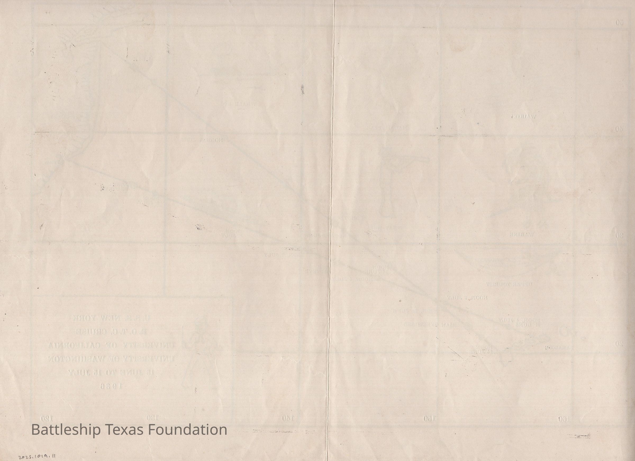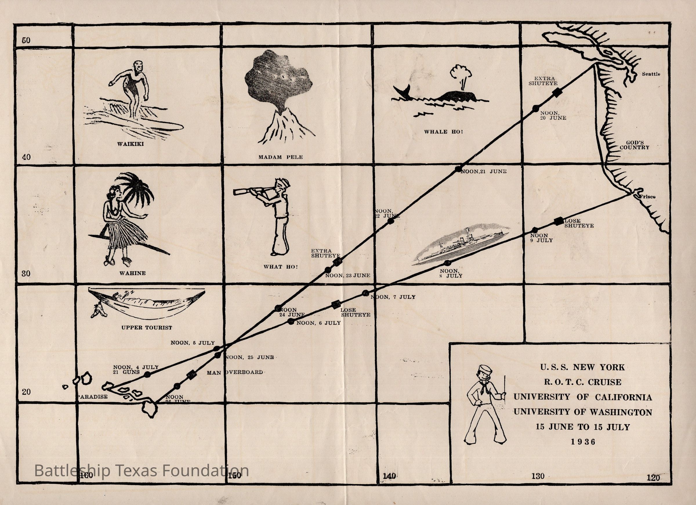 Map showing the cruise route USS New York took while carrying R.O.T.C. from the University of California and University of Washington. Trip to and from Hawaii occurred from June 15 to July 15, 1936.Context